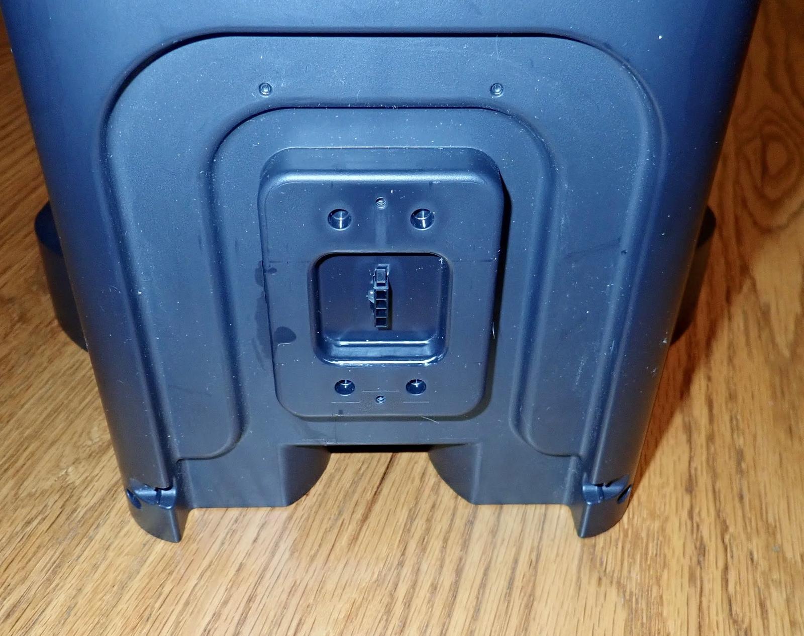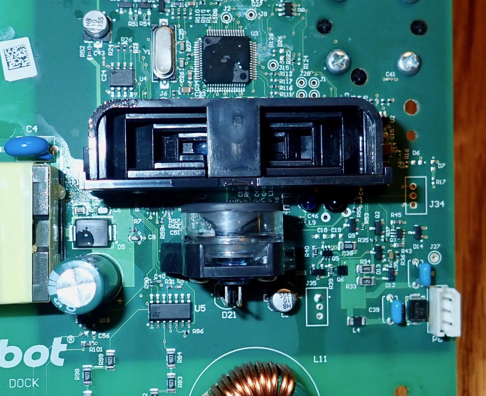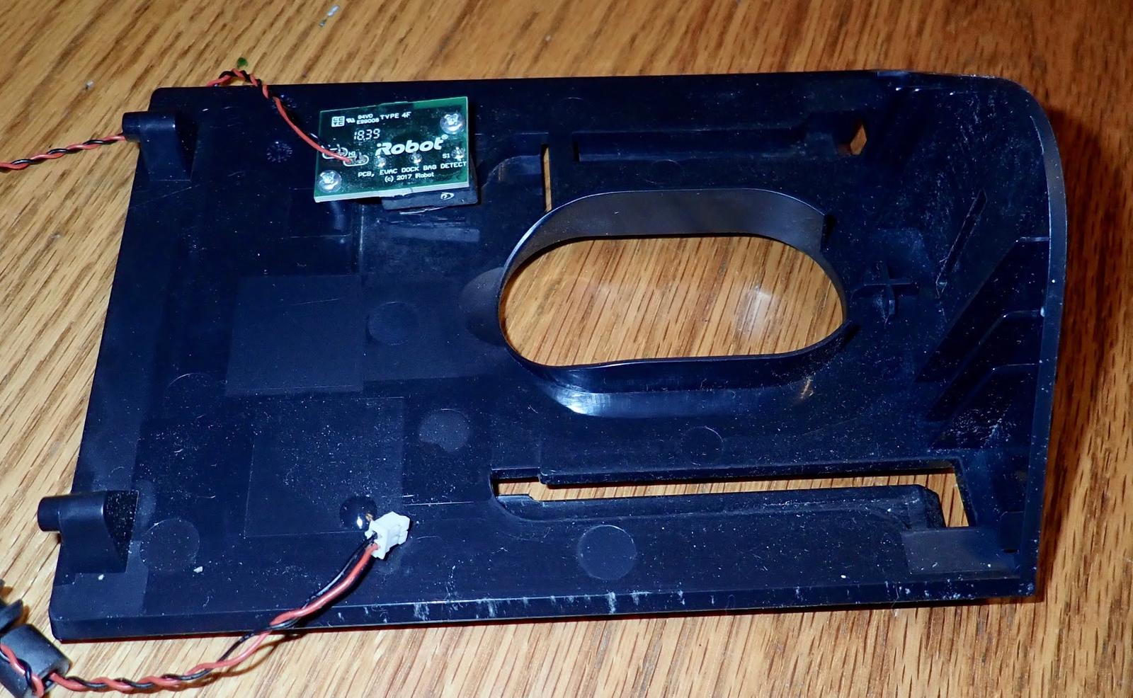 Towards the bottom, the large plate provides a stable base for the unit. The Roomba is emptied through the opening in the base. And, as near as I can tell, the communication is entirely through the IR-transparent black plastic glossy area in front. I didn’t find any evidence of anything fancy putting a signal on the charging pads. There’s clearly communication from the charging station to the robot, but I don’t know how much goes the other way beyond “I’m here, please empty me.” Which could be detected by starting charging. It looks like there are some IR receivers on the board, though - we’ll get there later.