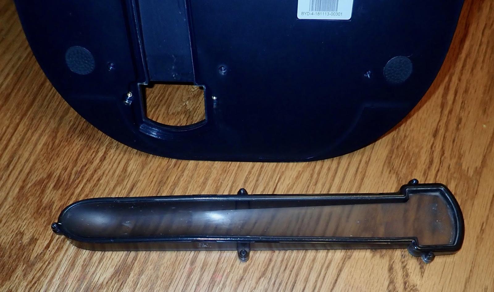 The easiest looking part to remove is the plate for the cord winder. The power cord loops around here as needed to give you the right amount of cord to plug in to the wall. It works quite well - you can see the left/right exits at the bottom, and how you loop the cord gives an awful lot of flexibility in the cord length.