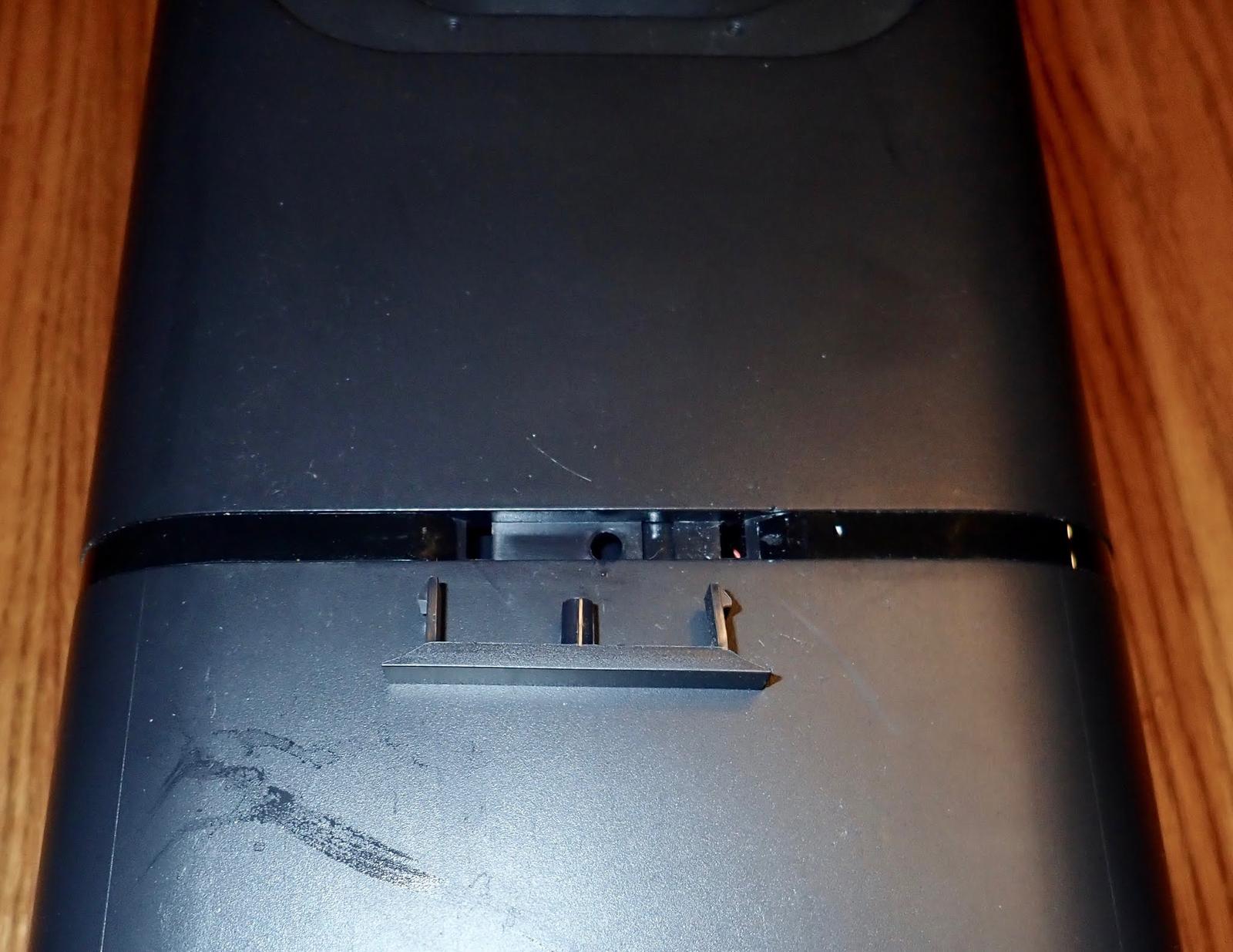 Out of other ideas, I decided to investigate the stylish dividing line further. It’s reasonably rare on modern consumer electronics to have things present that are totally useless. Around the back of the unit, a bit of prying on the plate at the center popped it free, revealing the ends of the divider. It feels a lot like some sort of thick plastic tape…