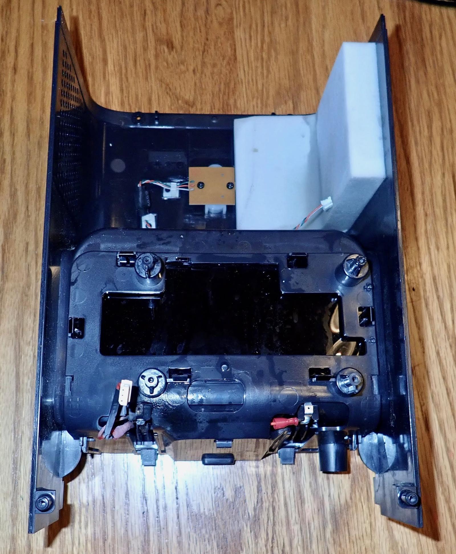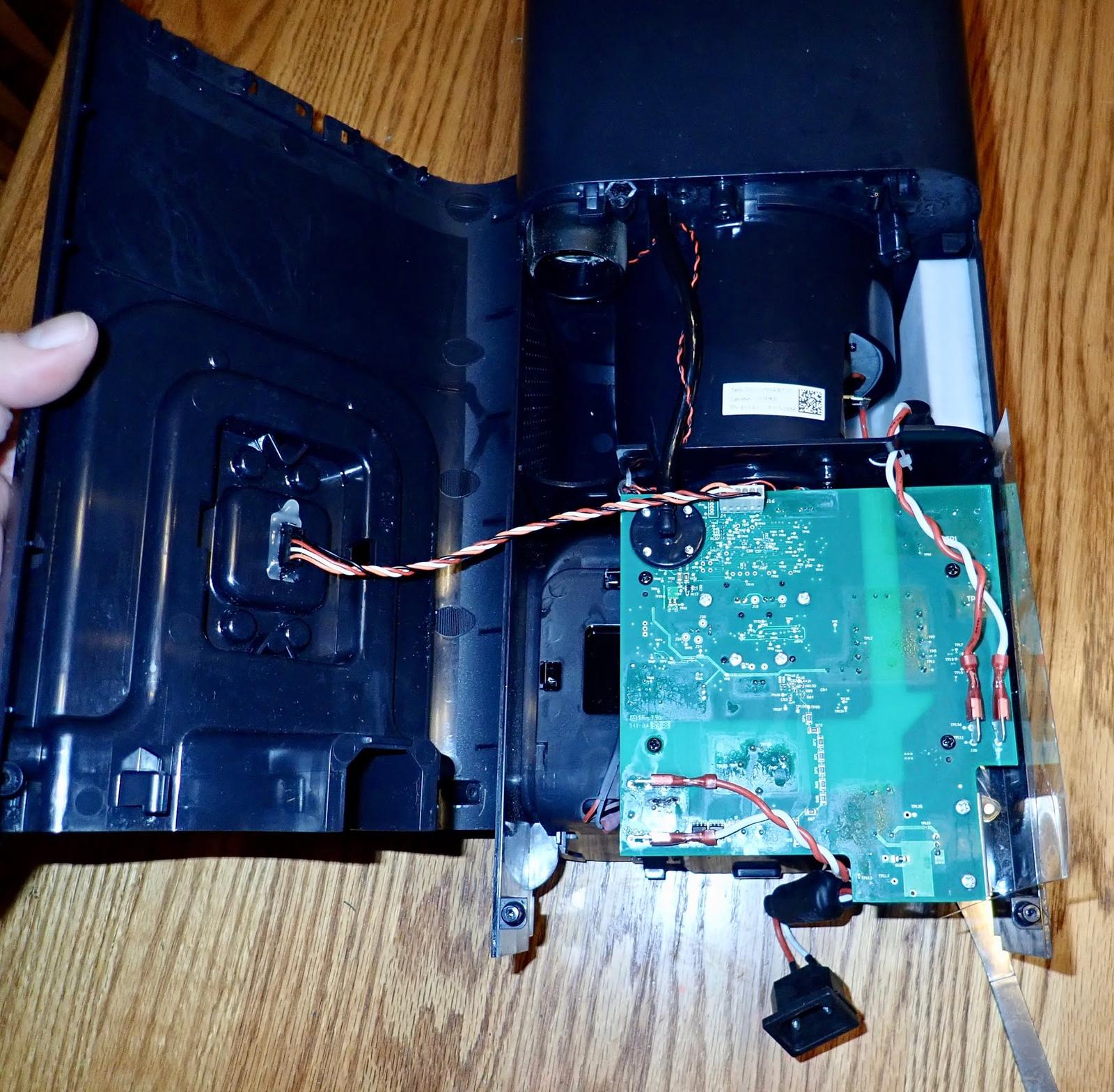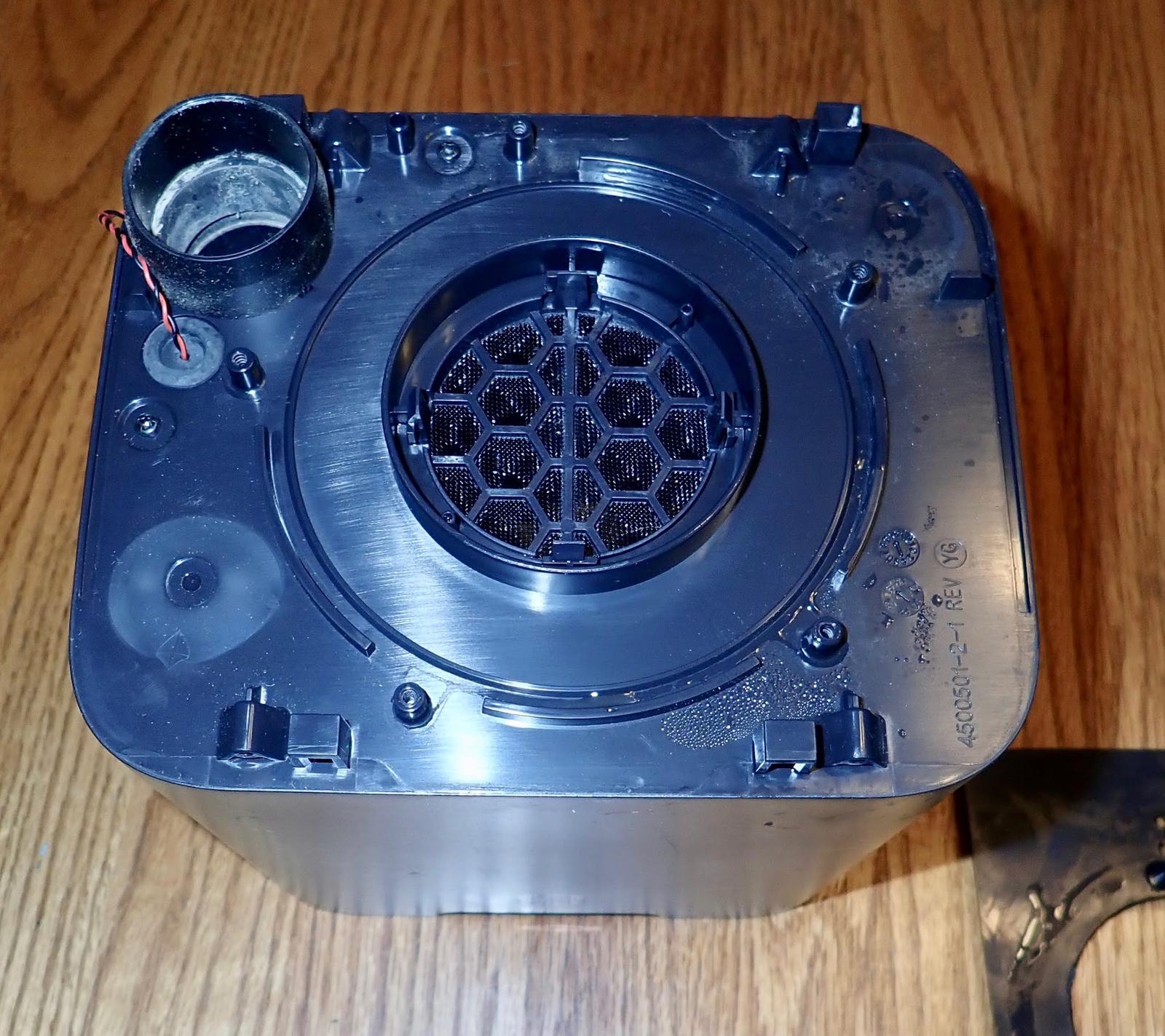 Continuing on, the front case comes off. The status LED is the gizmo on the circuit board towards the top, near the noise reduction foam. The opening on the left is where the vacuum air escapes, having hit the foam and gone around the sides. This approach keeps the roar of the vacuum damped, at least slightly. It’s still quite loud, though - you can’t have a conversation near it while it runs, and it’s more than enough to disrupt a sleeping 18 month old if you screw up the timing.