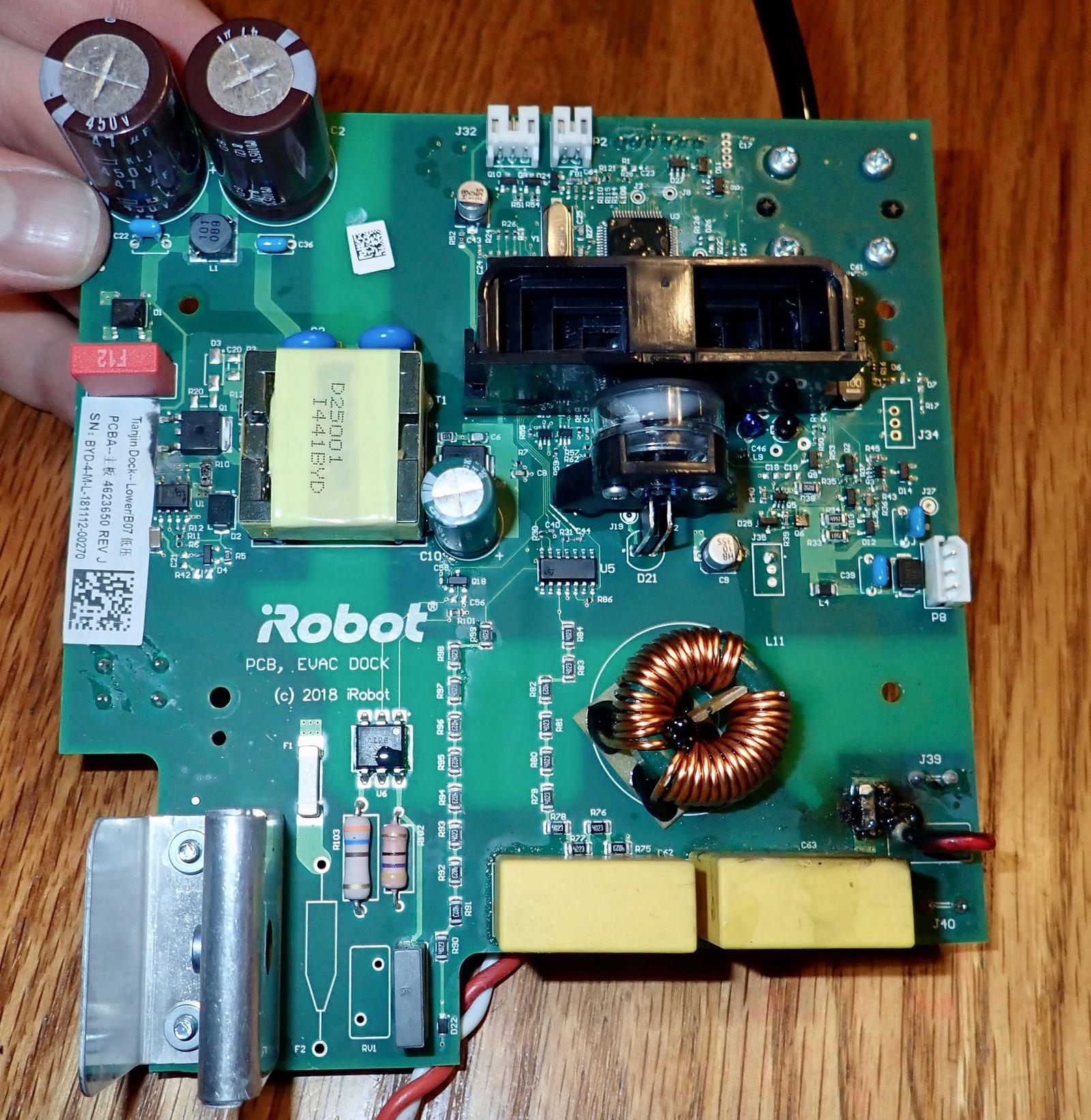 As it turns out, a clean base is not waterproof. It’s actually not even marginally water resistant. If a Roomba sucks up water (which, it turns out, it will happily do if wading through some water on the floor), and the clean bin empties the water out of the Roomba’s bin, it will destroy the clean base alarmingly quickly. The water flows into the clean base’s bag, collects a wonderful collection of (conductive) stuff as it percolates through the bag, drips through the open housing of the motor, and down over the main circuit board - where it fries the board completely. We’ll get there, but if you think your clean base has taken water, unplug it immediately. Mine probably would have survived if I’d done that and cleaned it, but as I realized there was a problem when the vacuum motor randomly switched on (and stayed on), paired with the distinctive smell of scorched circuit board… well, it’s now a mostly worthless pile of scrap. But at least I can get a blog post out of it.