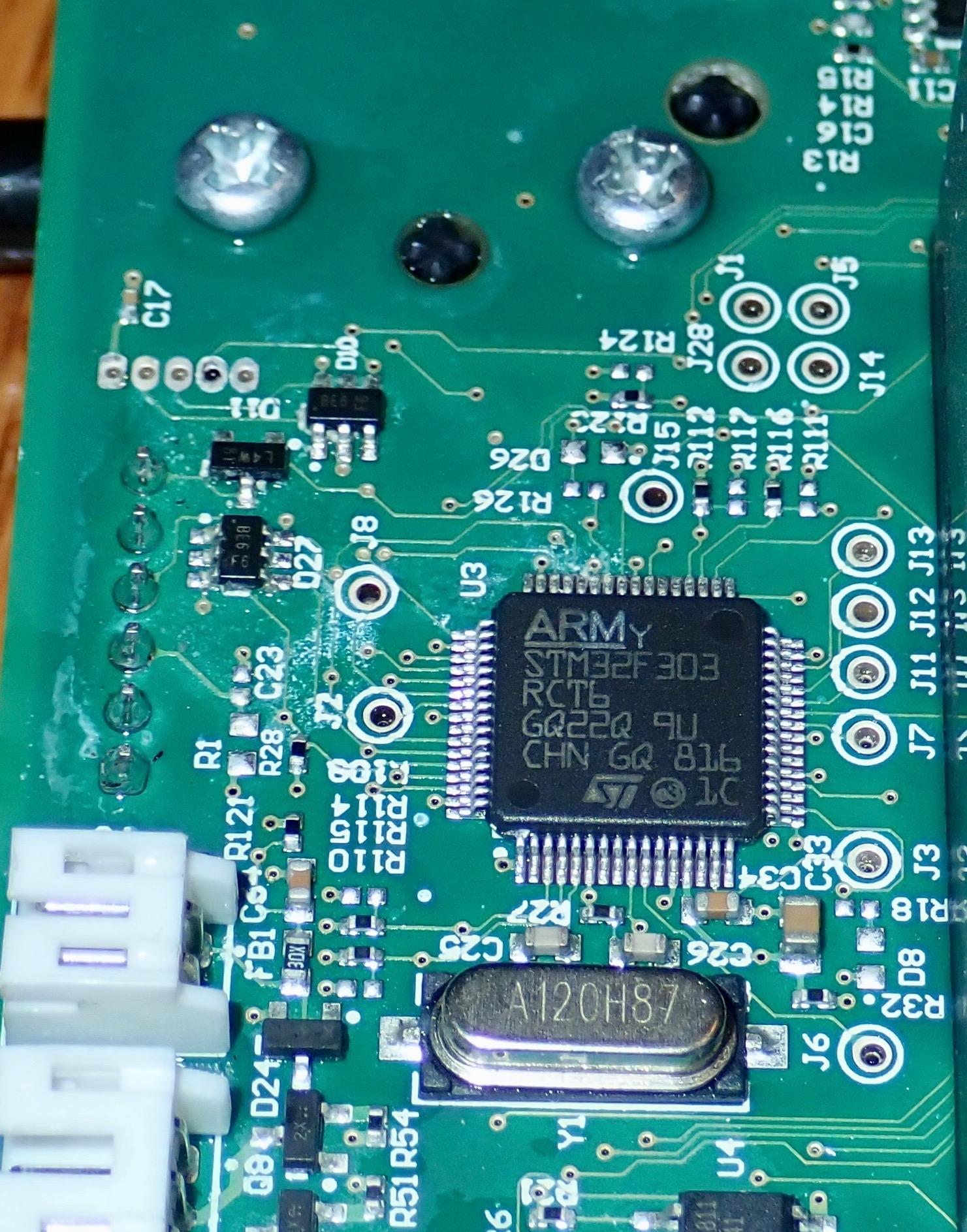 The main IC is an STM32F303 - a 32-bit Cortex M4 based microcontroller. It’s certainly enough to manage something fairly simple like this system! The A120H87 oscillator below is another mystery meat component I can’t find reference to.