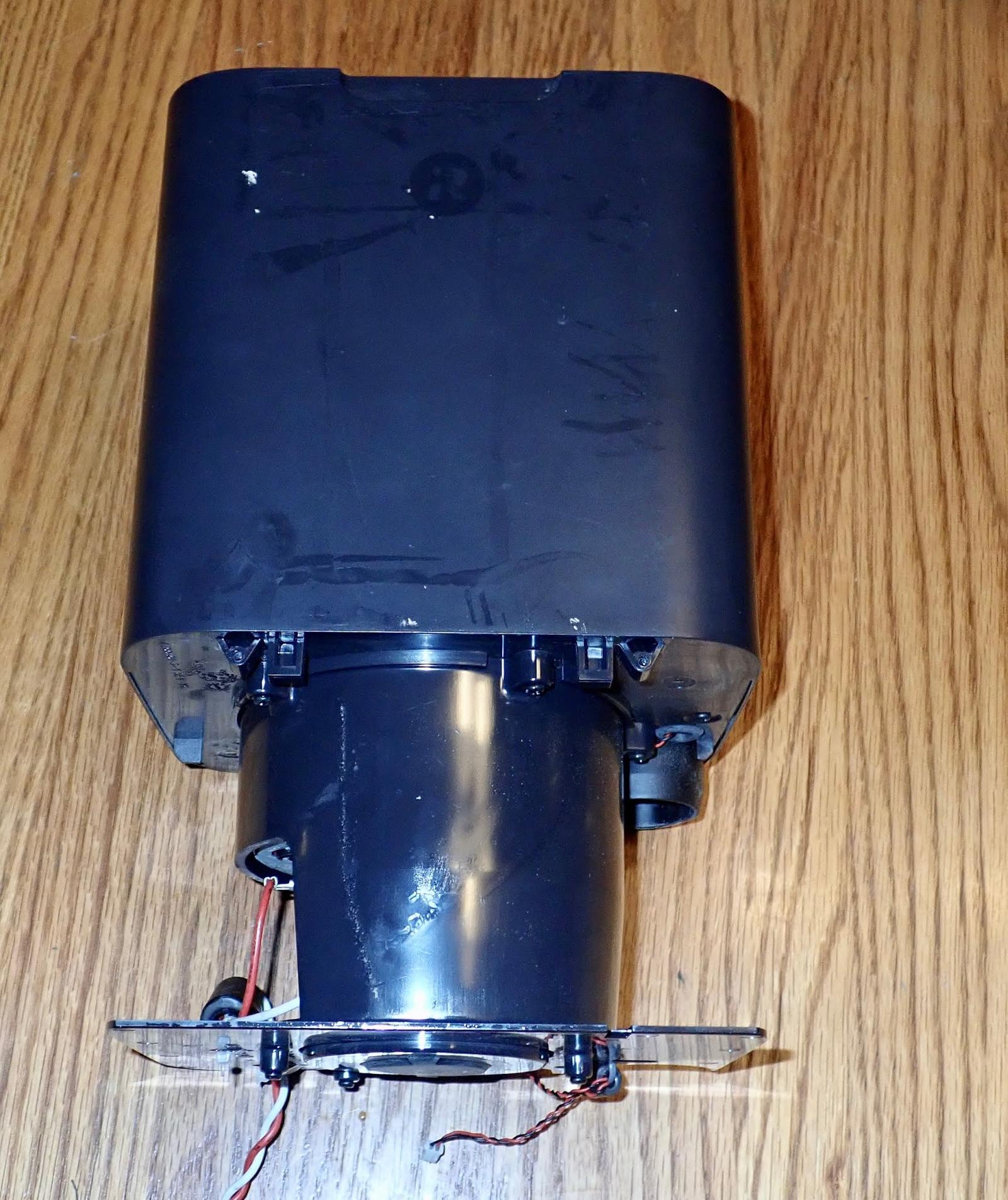 The big openings on the side of the casing are where the air comes out. This is, quite literally, an insanely powerful motor with an impeller on the end. It sucks air through and blows it out the sides. The air then rattles around in the plastic cylinder until it escapes, slams into the foam, turns around again, and heads out the side of the Clean Base. The black part at the bottom is a rubber donut that wraps around the motor and seals it to the chamber above.