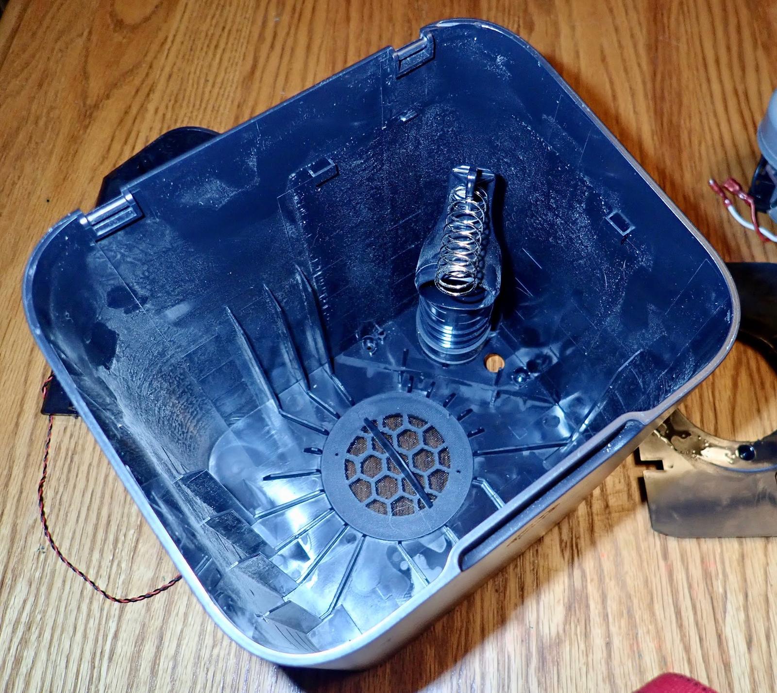 With the plate out, all that’s left is a mostly empty vacuum chamber! The flexible hose stalk and lever work as described long ago, and the bags just sit in here, filtering and collecting.