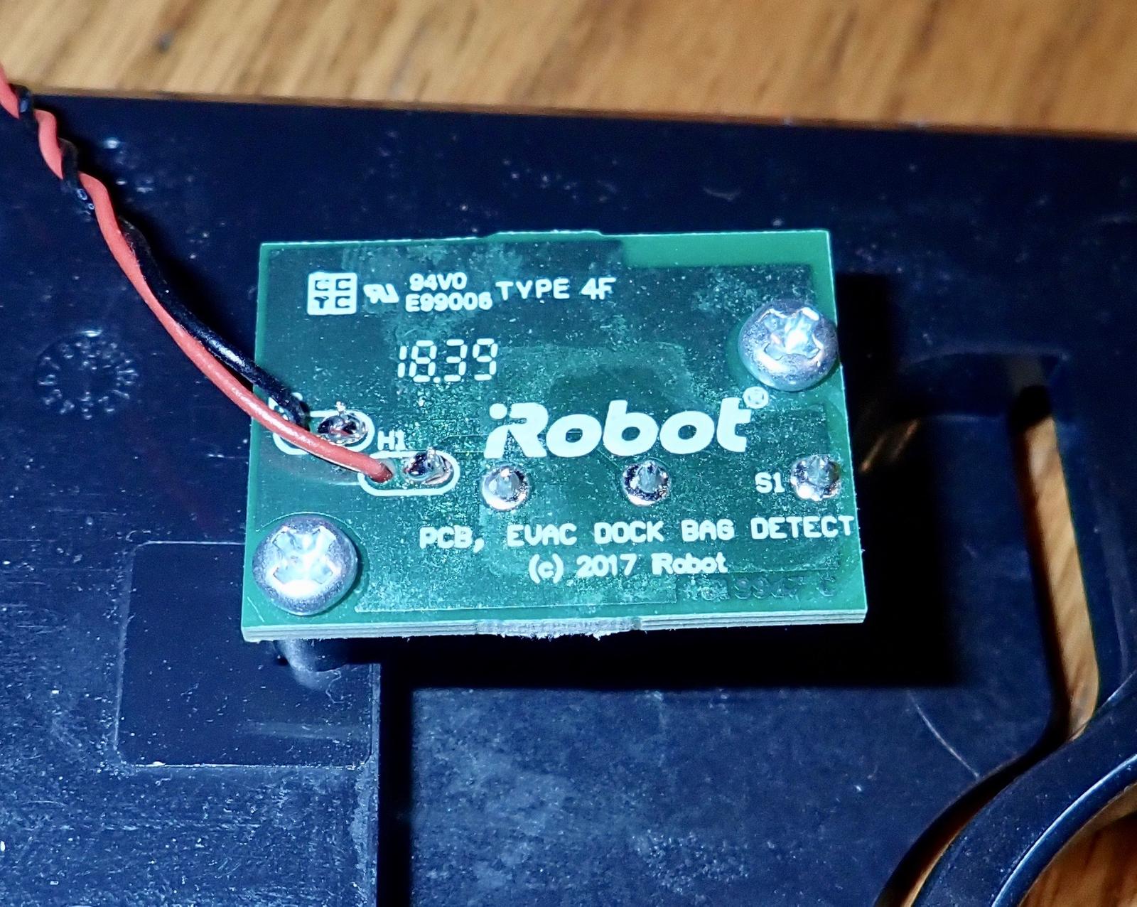 This board/switch is a “PCB, EVAC DOCK BAG DETECT,” copyright 2017. The purpose of this particular PCB is simply to secure the microswitch in place and allow the wires to connect. These little boards are quite common in iRobot products - the i7 has a ton of them scattered about. I’m fairly certain this board is hand soldered.