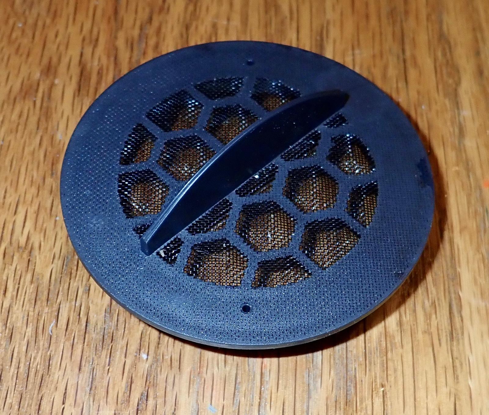 A filter finishes out the assembly. The mesh is melted onto the plastic, somehow. The bridge in the center prevents the bag from sucking tightly against this - so at least some air can get around as needed.