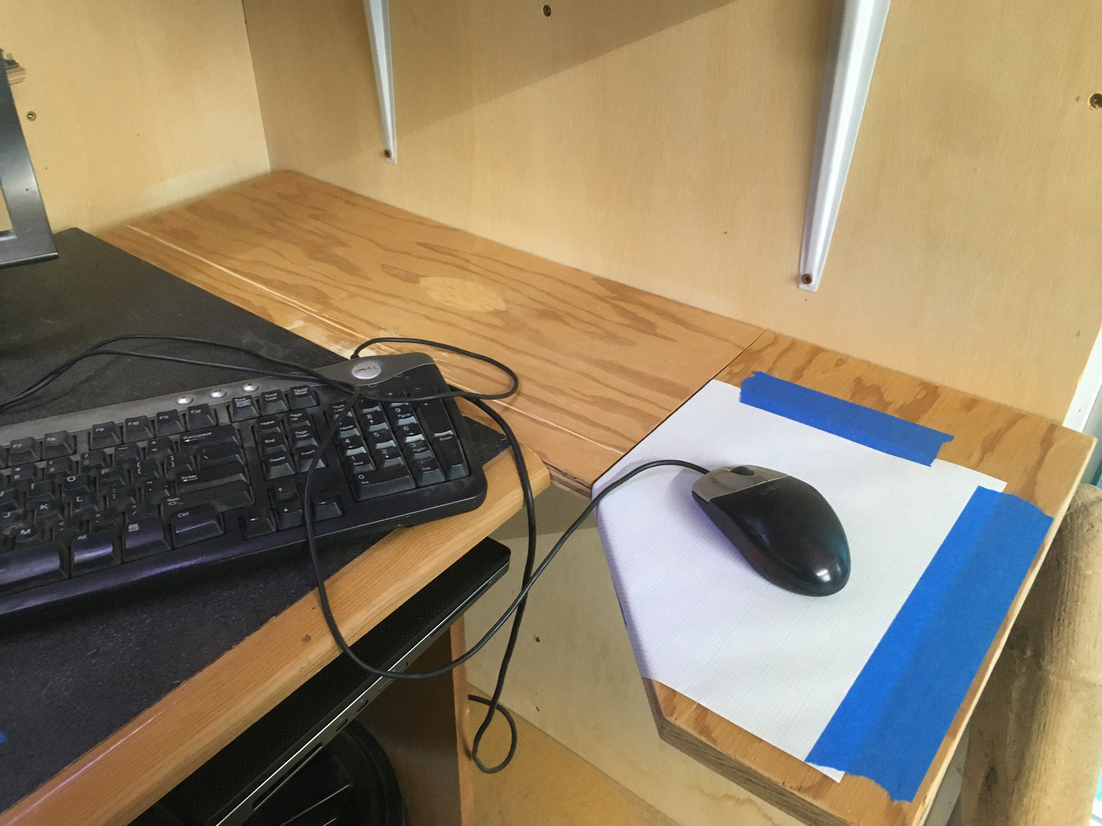 The only recent addition to the inside has been replacing a pile of boxes with a plywood shelf for a computer mouse and other assorted stuff. The hazmat shipping boxes finally got moved out to the shipping container.