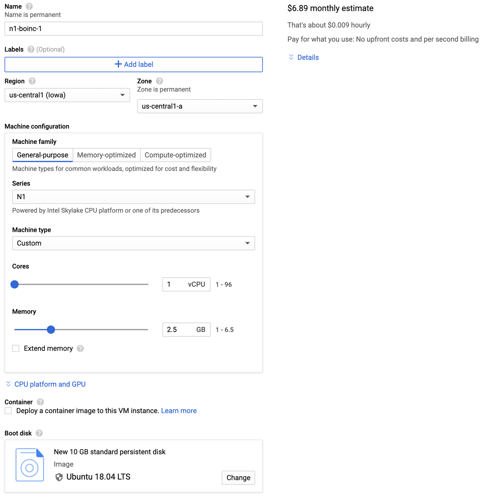 In any case, you’ll want to set the disk space large enough to handle everything. Again, per-task size varies, but 10GB + about 2GB per CPU core should be more than enough. If you’re doing this a lot, why, I bet you’ll optimize things! While you’re sizing your disk, select Ubuntu 18.04 LTS - it’s a good base to use. No, Clear Linux doesn’t really matter for something like this!