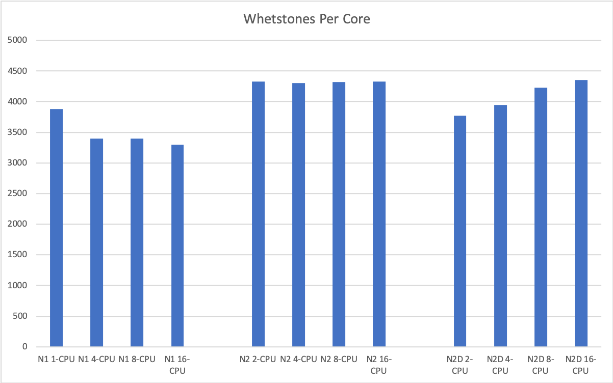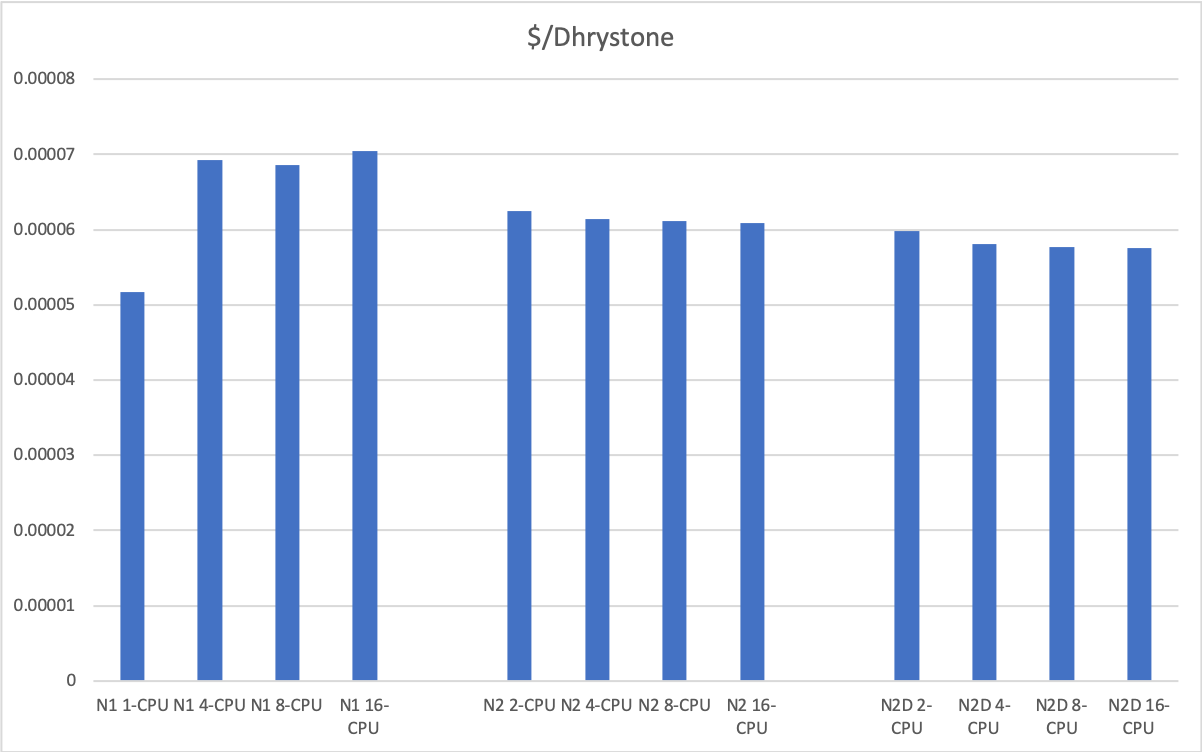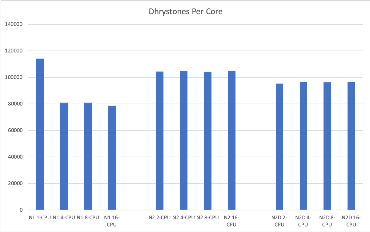 Does this hold for integer operations in the Dhrystones benchmark? Not really. The only thing that stands out here is that the single-CPU N1 instance outperforms the others - and this makes sense. With all the microarchitectural vulnerabilities across hyperthreads, it’s a good bet that Google isn’t scheduling other VMs on the other virtual core, so the single CPU N1 instance has a “full physical core” and the other stuff is sharing core resources. No real difference here.