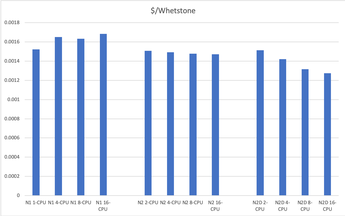 On the floating point side, the N2 instances certainly perform well, only beat by a large AMD instance (16 core). The performance boost on extra cores from AMD is certainly helping here, though there’s not quite as huge a difference as I’d expected between instances. The price per performance is remarkably consistent across instances.