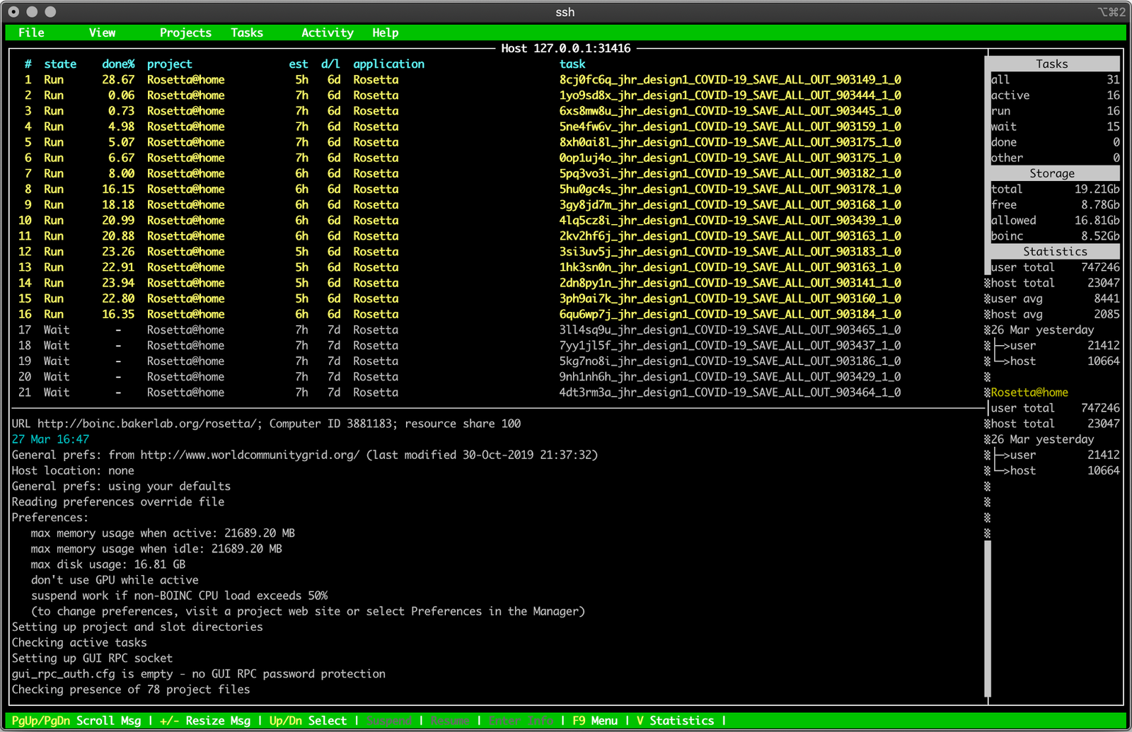 But what it boils down to is that you have computers that download workunits (chunks of work and the binary to work on them), do some amount of processing on them (between a few hours and a few weeks, typically, though most workunits are on the “hours” side), send the results back, and this is the process of Doing a Science.