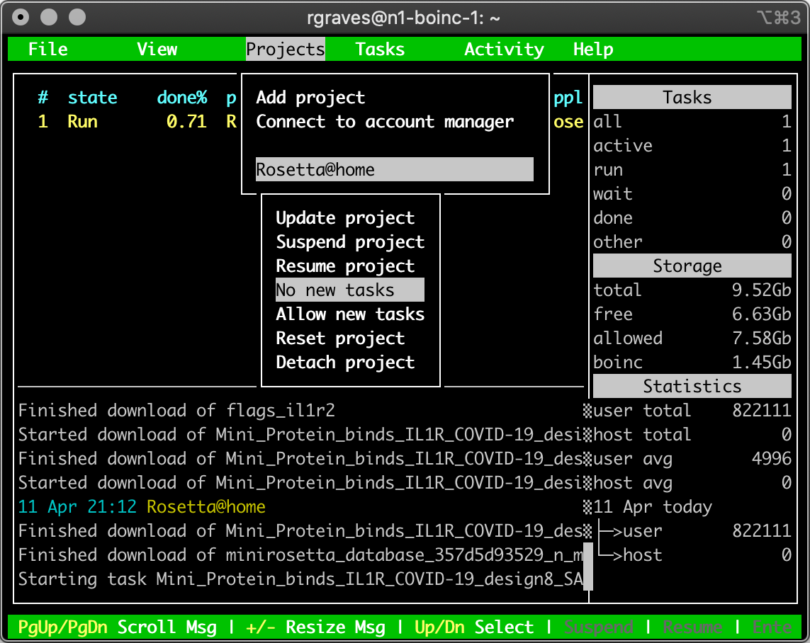 If you’re getting near your $300 freebie credit, or whatever you want to spend, just finish out your work units before terminating the instance. Under the boinctui menu, select the project, then “No new tasks” to prevent it from requesting any new work. Once the stuff is finished, then delete the instance. It’s just not nice to leave half competed workunits lost to the void - yes, they can handle it, but it’s still just kind of being a jerk if you can avoid it.