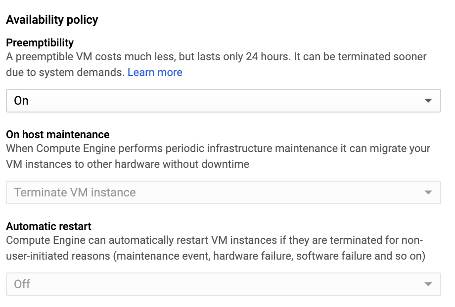 To start the process out, you’ll want to create a preemptible instance - and it’s vitally important that you expand out the options to do this, otherwise there’s no point and you’ll spend a ton!