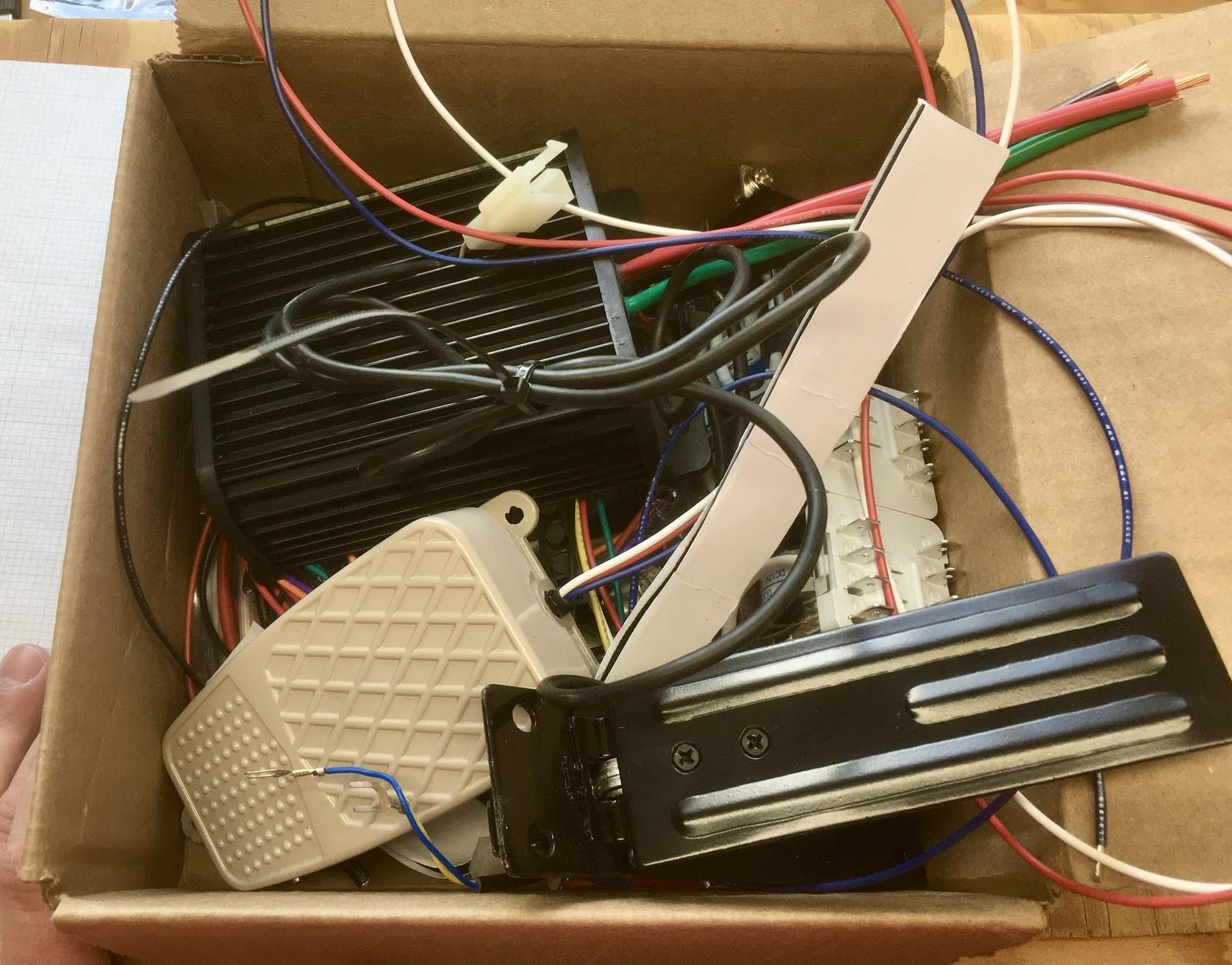 The brake pedal on the right seems to be a nice SPDT switch - it connects the input to one of the two outputs, but not both. This pedal works as a nice safety switch on the system as well - pressing it will cut power to the motor, even if you’ve got the throttle held down.