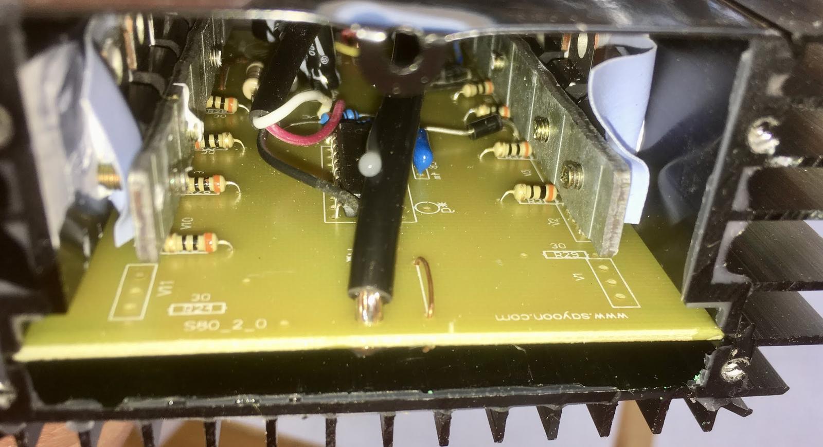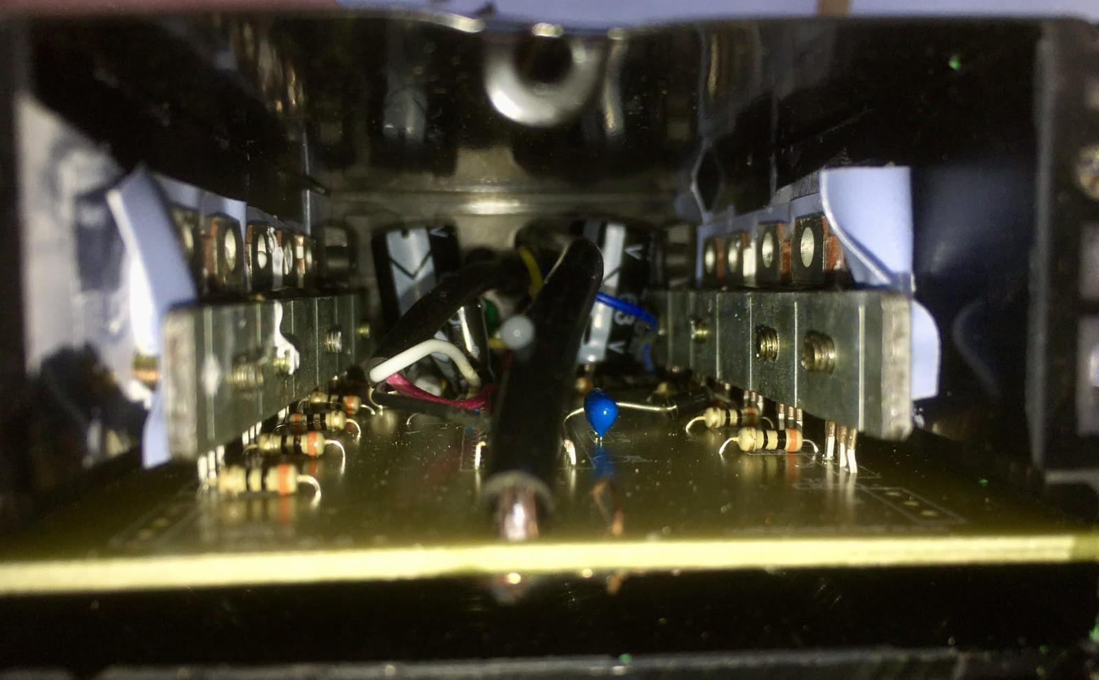 I’ll tell you! Two rows of power transistors, heatsunk to the case! This is quite nice to see - it looks like a halfway sane design on the inside. I’m not pulling it all the way open, simply because I don’t want to bother re-aligning everything, and, again, it’s my daughter’s controller, not mine to rip apart. There’s good heatsinking on both rows of transistors, and if they fail at some point, they should be easy to replace. I even see what look like spots for more!