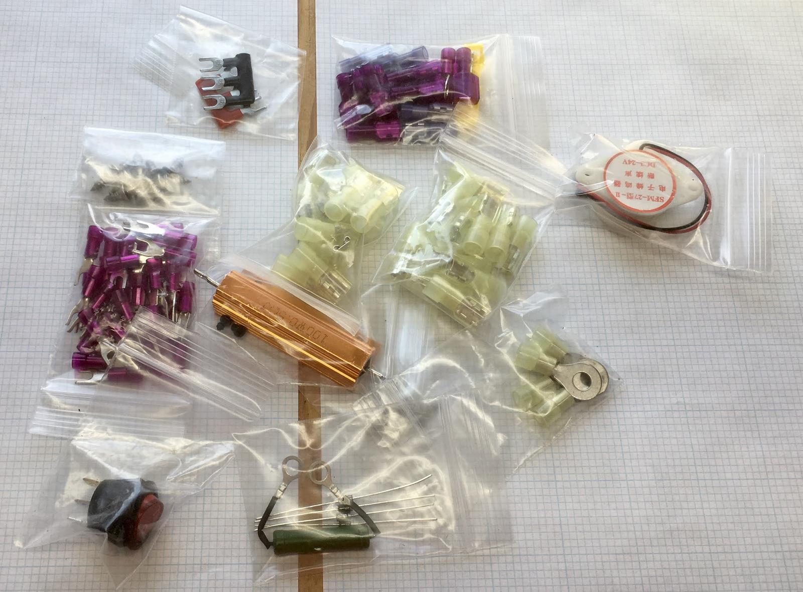 Finally, there are a ton of connectors and gizmos and gadgets! We’ve got, in no particular order, a ton of crimp connectors, a backup beeper, a big resistor for the brakes, an on-off switch, a precharge resistor that helps prevent arcing, and some terminal block connectors. I’ll be using most of these!