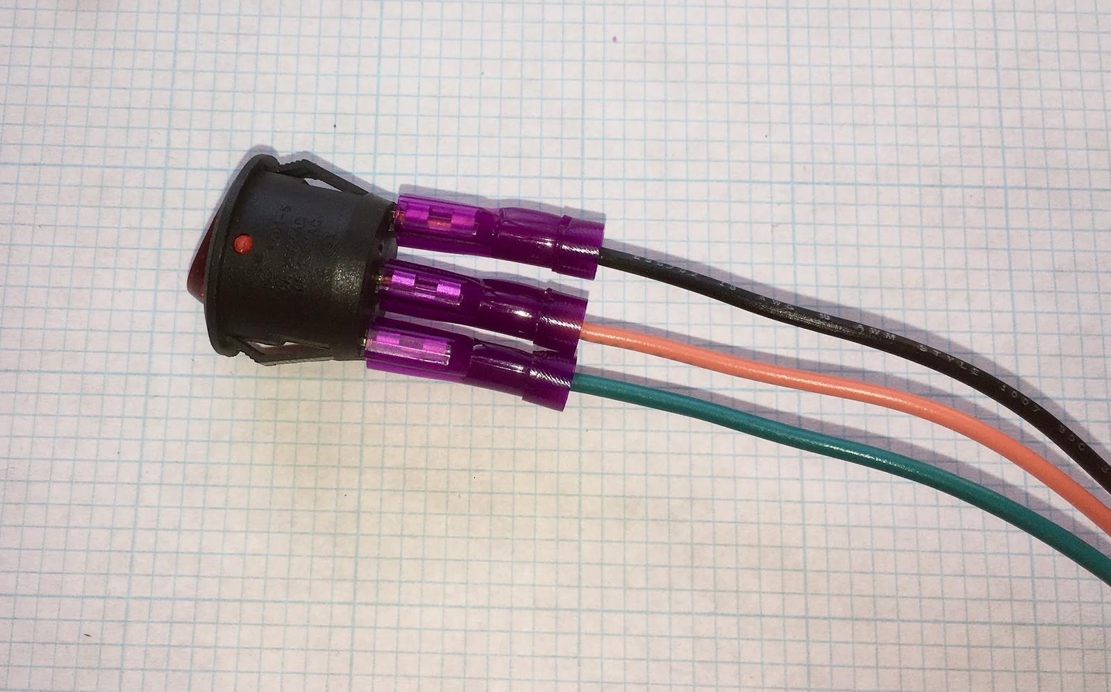 Sometimes, you’ll have to puzzle out wire lengths. For the power switch, for instance, you should have a roughly-similar length green and orange wire. Cut a length of the (rather long, because it’s used all over) thin black wire to match! Presto, a matching wire harness! Though for the switch, you might consider holding off on actually wiring it up until you’ve got a hole worked out for it. It’s far easier to put through the hole and then put the connections on.