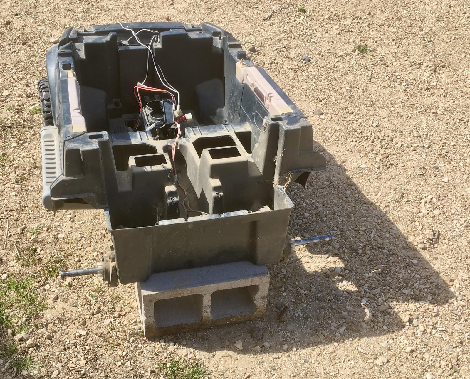 On the floor, you’ve got the throttle switch, which does one of two things: Provide battery power to the motors, or short the motor windings for maximum braking. It’s safe enough, and doesn’t tend to fail in weird ways, but it’s somewhat violent - there is no concept of coasting. Without weight in the back, wheel slip means you just spin/slide the wheels for acceleration/deceleration - but it also means that you can’t get up a small gravel driveway slope, because there’s no traction. With a cinderblock in the back, it’ll hook up - and slam you around pretty hard.