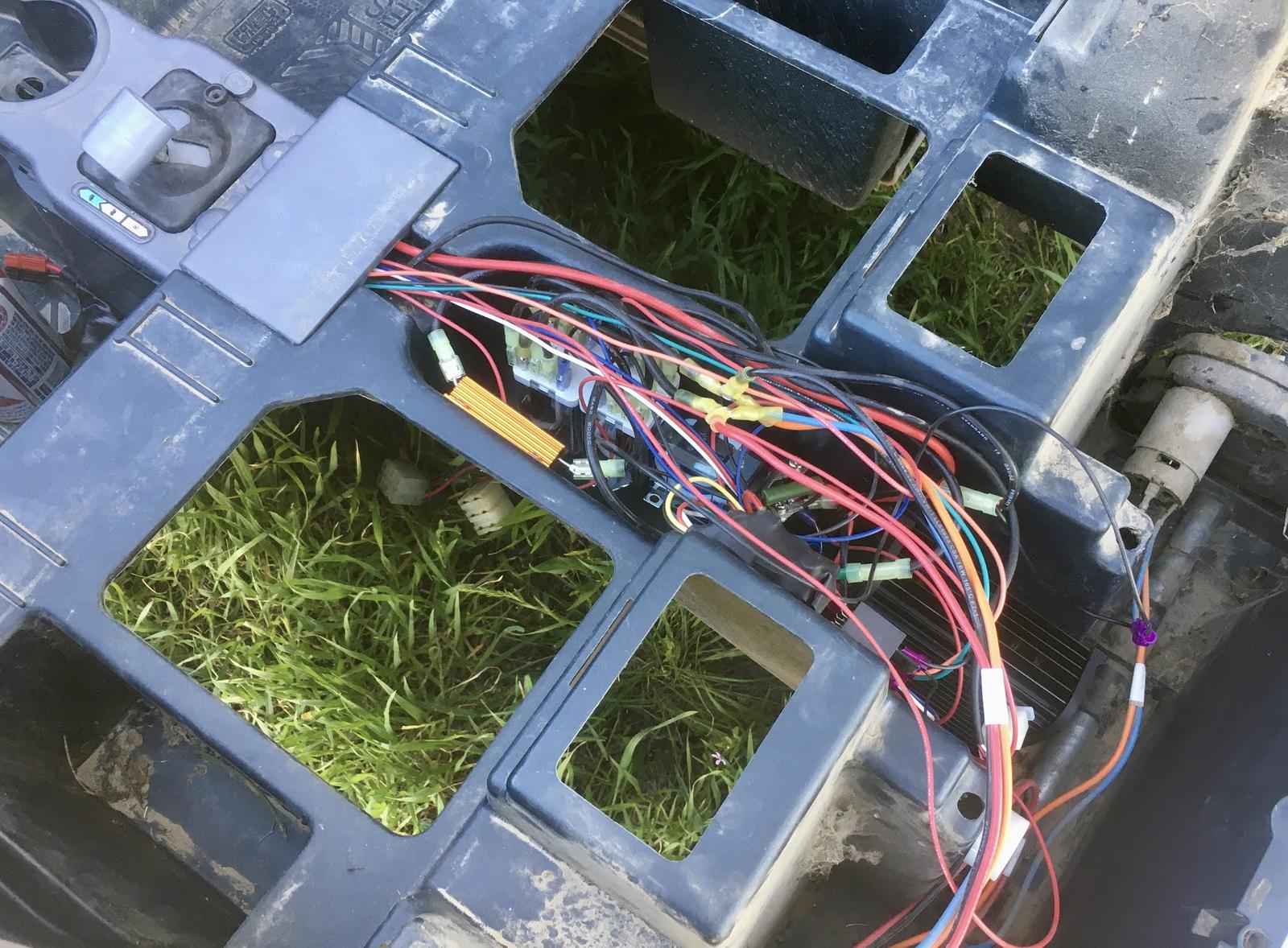 My advice? Fit everything and route the wiring before you screw stuff down. I had to remove the throttle once or twice to route everything properly. You can see the hole I extended up towards the “firewall” to route the brake wiring. Initially, I’d run it under the edge of the metal plate, but consideration of the violence of banging around a gravel driveway and the possibility of having to redo wiring after it got cut… it’s worth making sure nothing is pinched on a project like this.