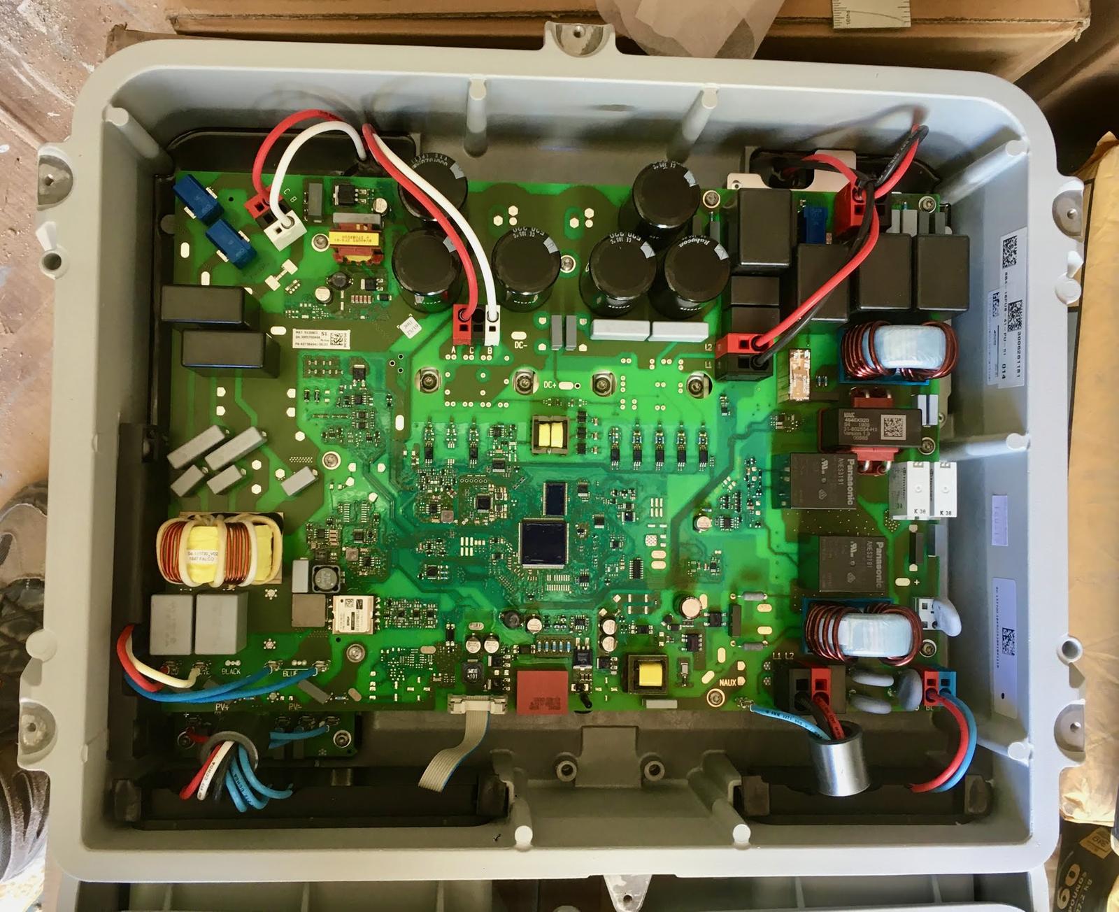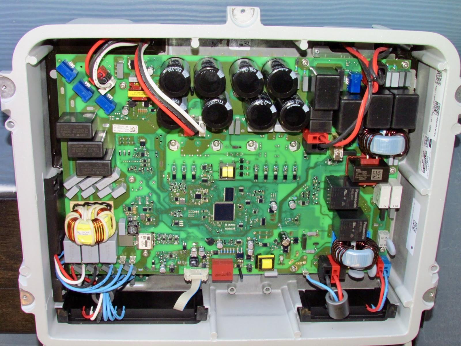 With the top off (not captive screws), you can see the main power conversion guts. This is a large, high quality PCB. This particular inverter is the 3.0-US - so only two MPPT strings. And you can see an awful lot of “two wires” chasing around.
