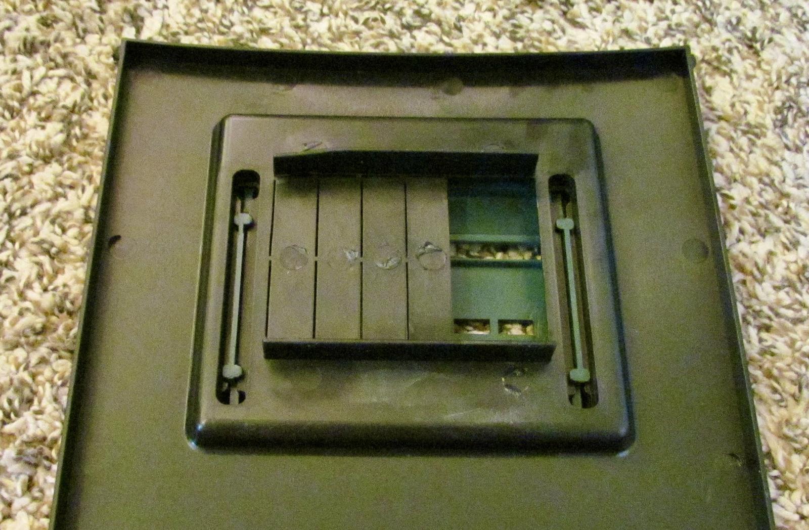 The back of the false front shows the removable breaker knockouts, as well as how the slider slides up and down. One can easily remove the slider if one wishes, and the non-disconnecting boxes use the same front, just without the slider.
