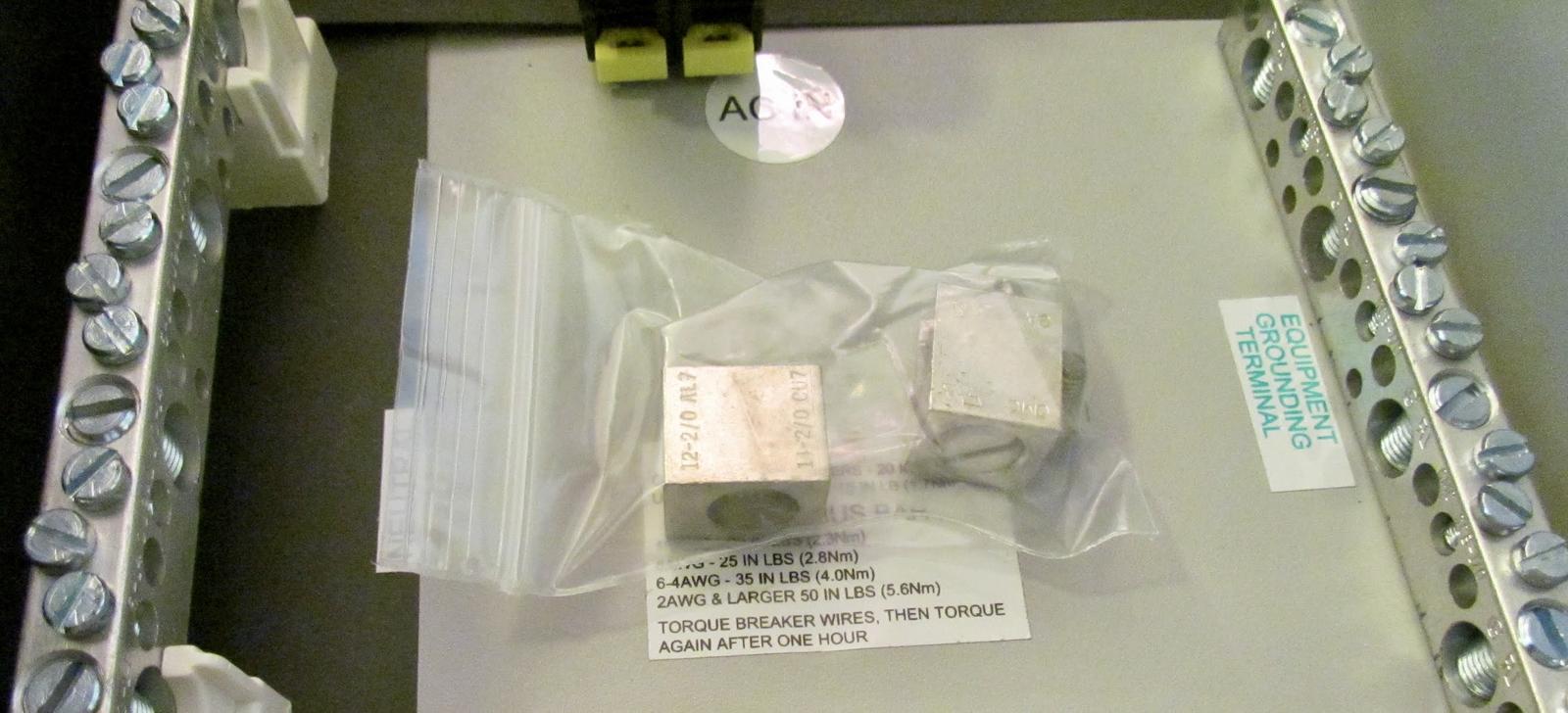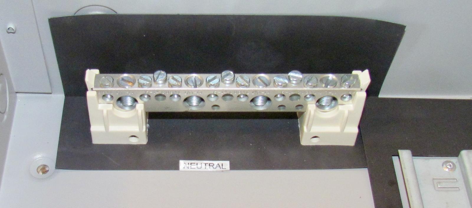 Going further in, you can see the rail on the back that breakers mount on as well as the neutral bar (left) and the ground bar (right). The black material is a bit of insulation that helps prevent any wires from making contact with the box (ground) unless intended, though I’m not sure exactly what valid use case has loose (live) wires that might make contact with the box. If they did, I’d think shorting to ground and popping the breakers would be the right option. In any case, the insulation is easy enough to remove if you don’t care for it. Also, a torque spec sticker!