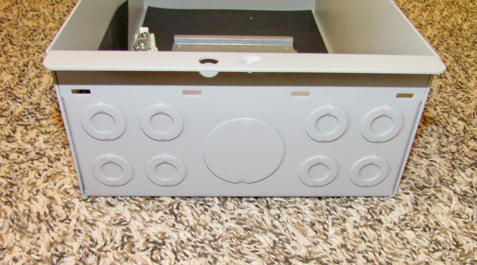 The back contains a single knockout, perhaps useful for routing power in, or going through a building wall. It also contains some screws for the ground busbar, which prevents it from sitting perfectly flat against a wall.