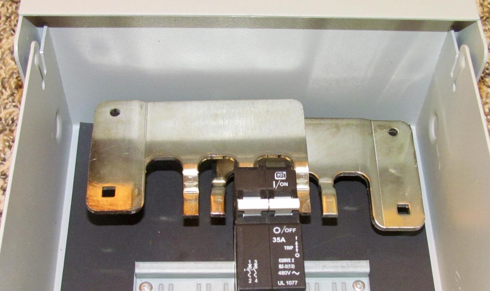 Opening it up, you can see the slider that operates the circuit breakers, and the handle that grasps the slider. It’s really quite simple - rotate the handle, it rotates the thing inside, which moves the slider up or down to open/close the circuit breakers. Screw the whole thing shut, and you’ve got breakers and a disconnect, all in one!