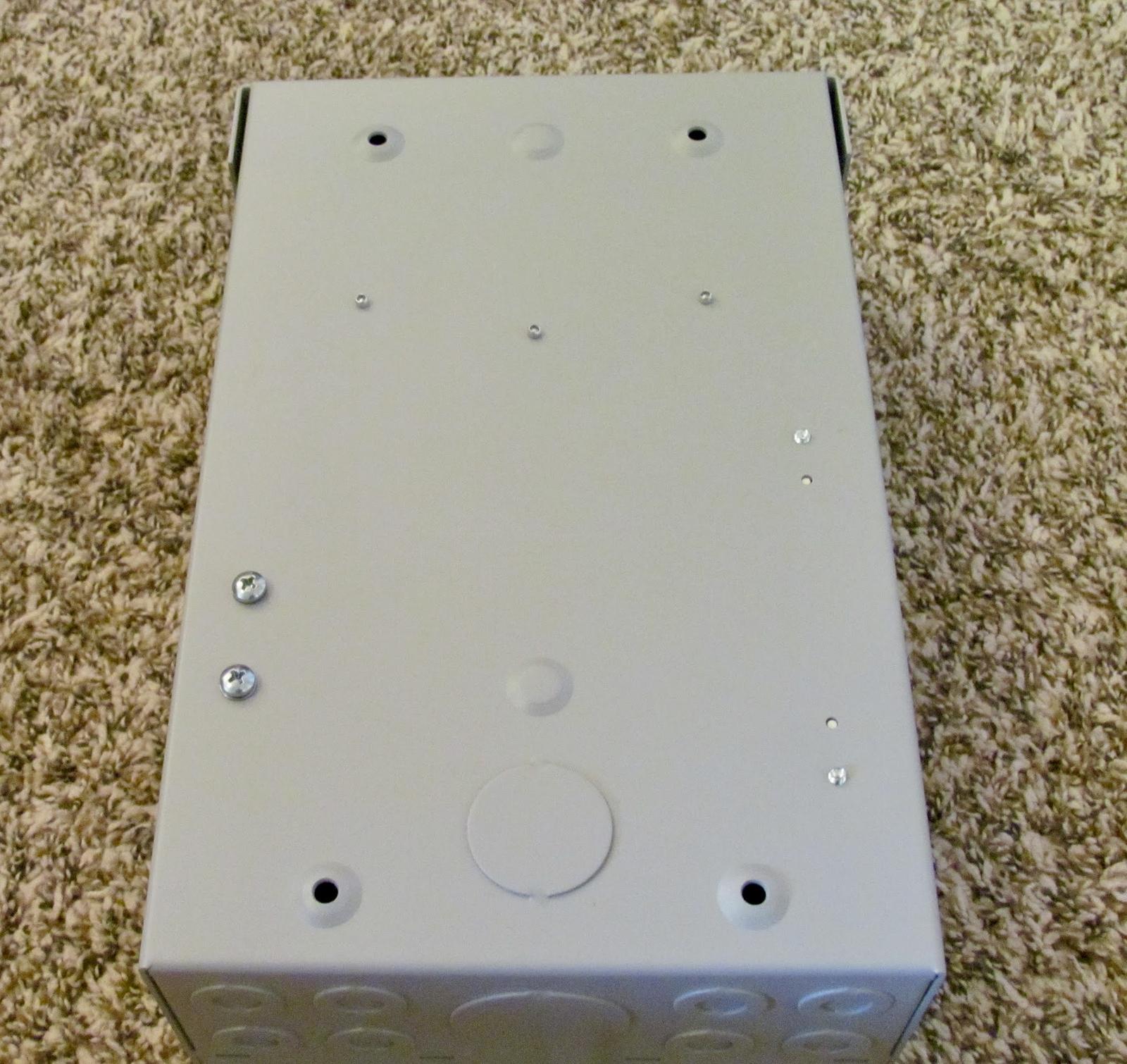 The bottom contains the usual selection of knockouts. On this box, the center knockout is for 1 1/4” conduit, and the rest are 1/4” or 1/2”. If you need larger, drill them out!