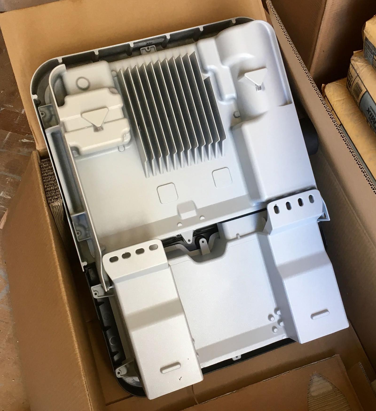 Flipping the inverter over, you can see the mounting bracket bolts on the bottom, and the giant heatsink fins on the back. If it looks a bit like there’s a thermal tunnel to route airflow to them, you’re right - this should have pretty good convective flow when working hard.