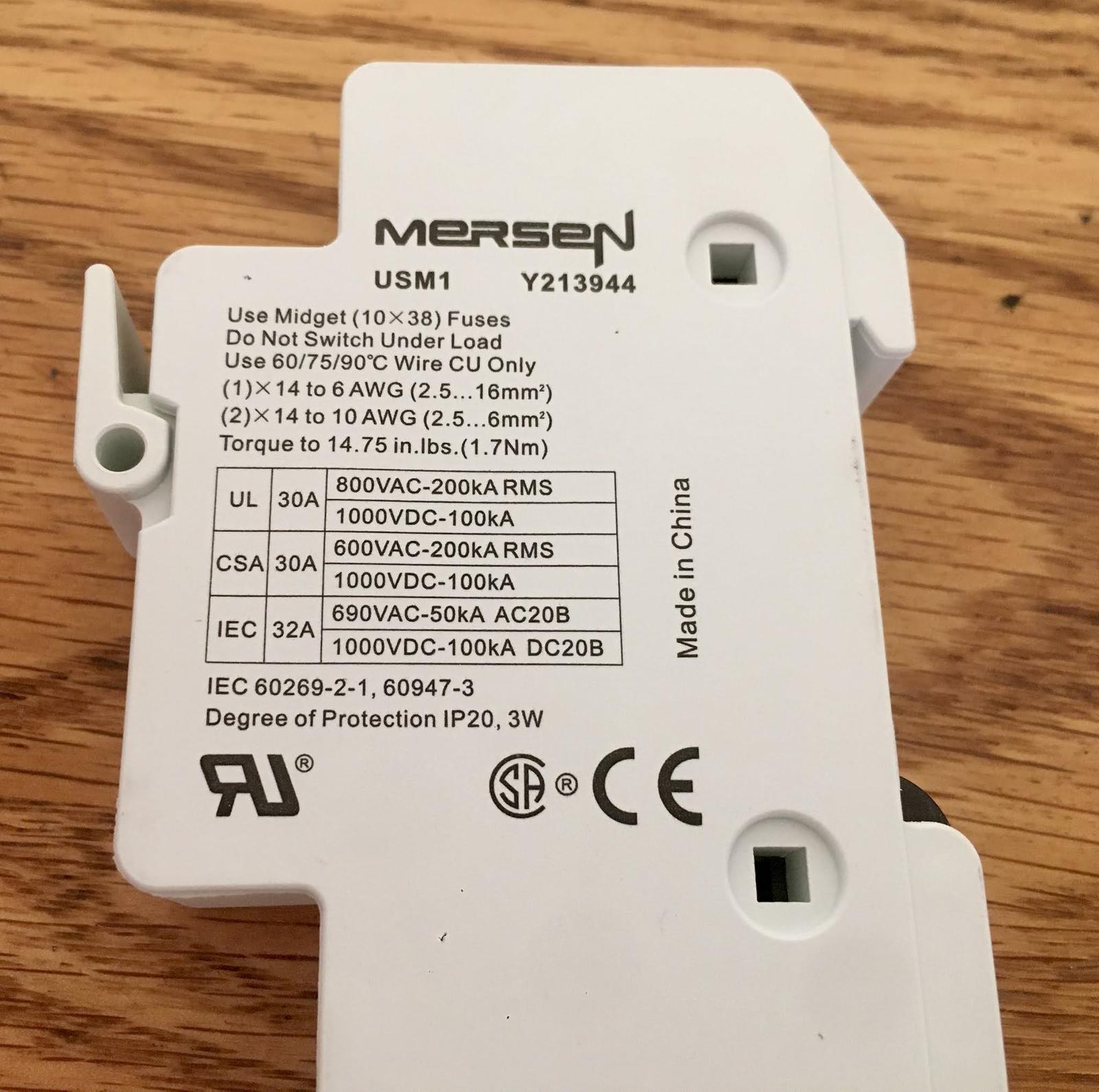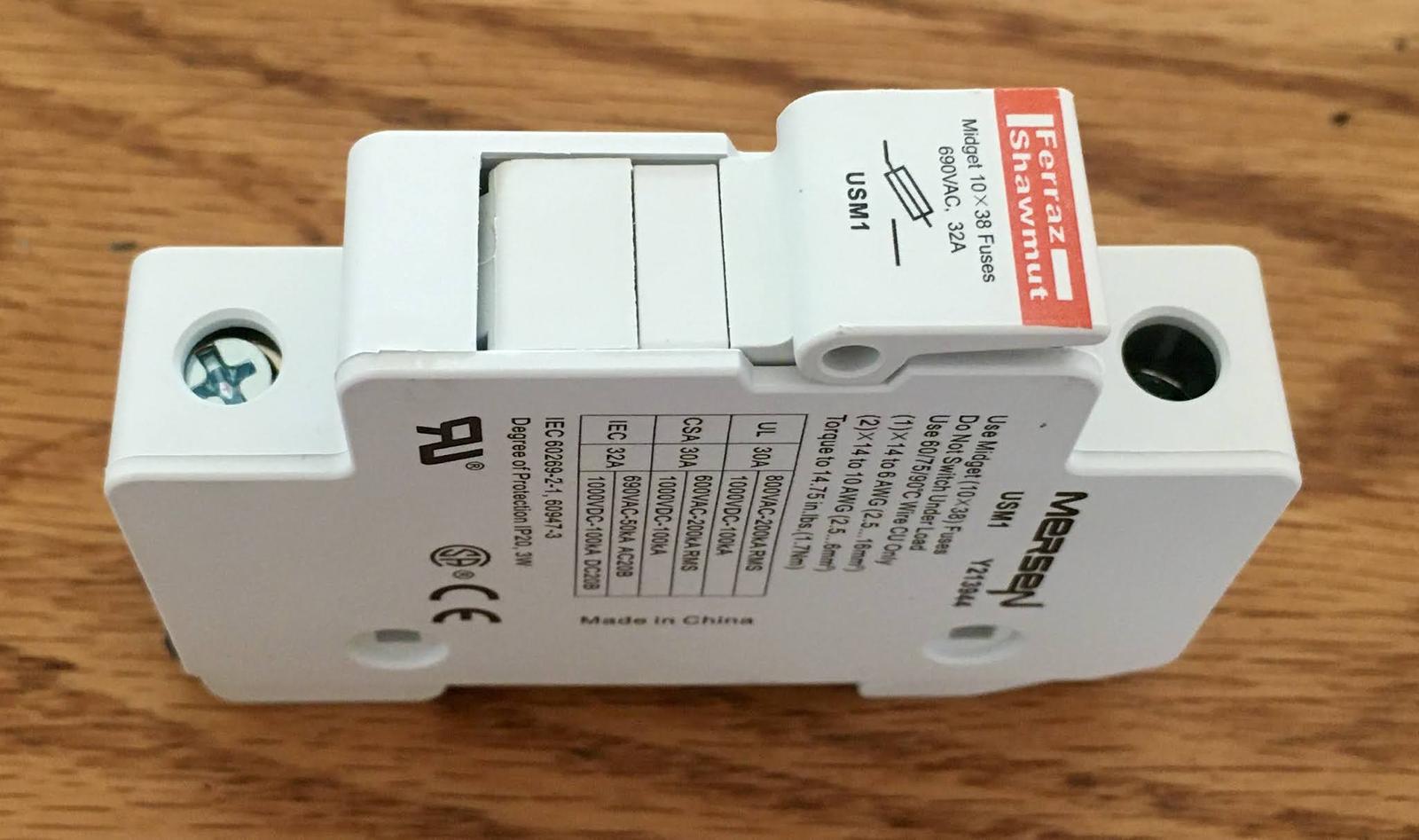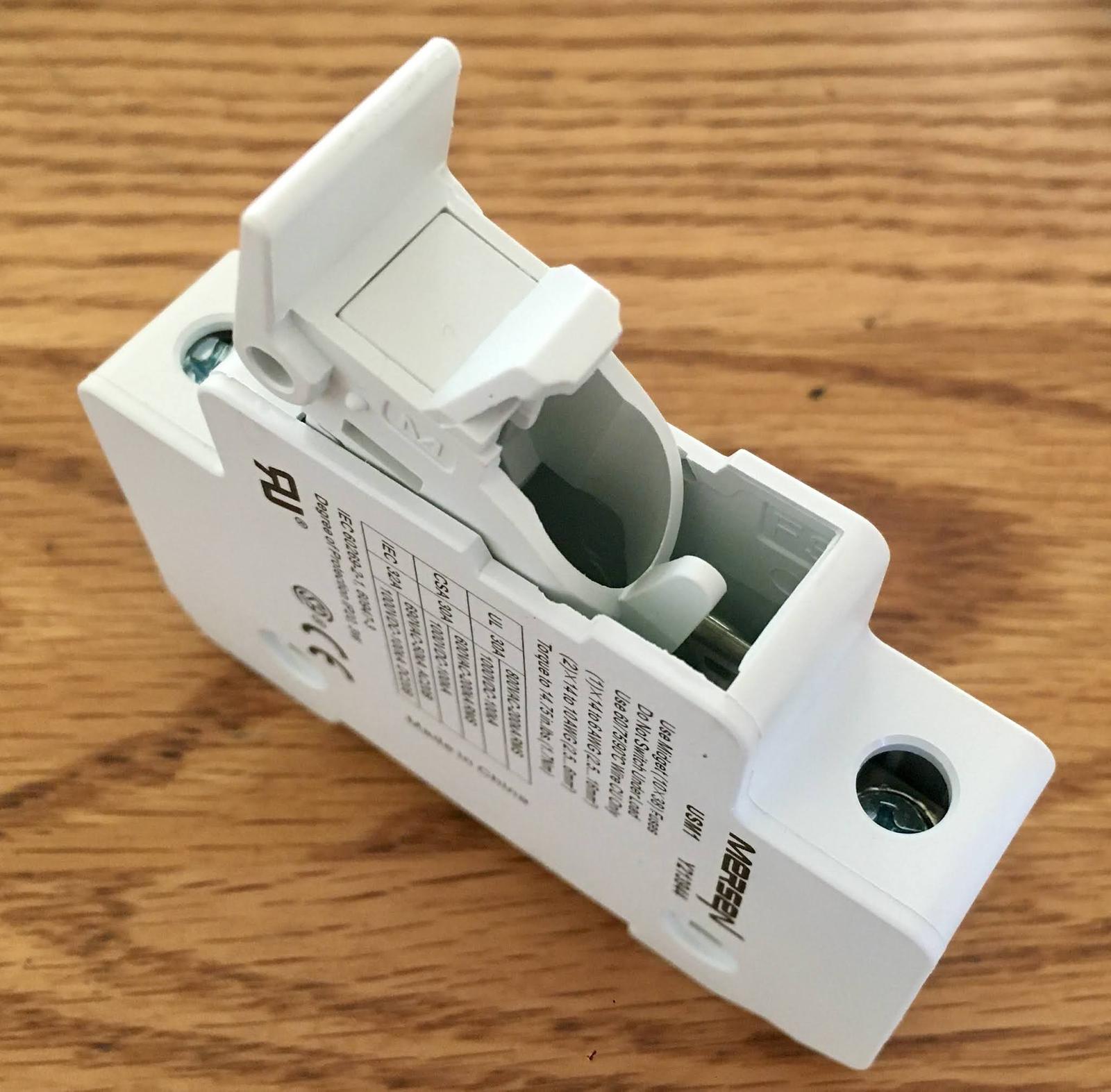 An almost-identical box is used for my panel string fuses. This doesn’t have the lever on the front, but is otherwise pretty much the same.
