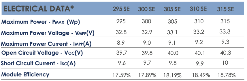 In terms of electrical data, these are still pretty standard panels. The 295 is the bottom end of the options, and makes some of the math a bit easier in terms of open circuit voltage in the winter, and some of the wire derating due to temperature. I was able to spec 12AWG for most of the runs and still be fine.