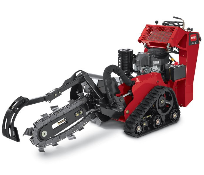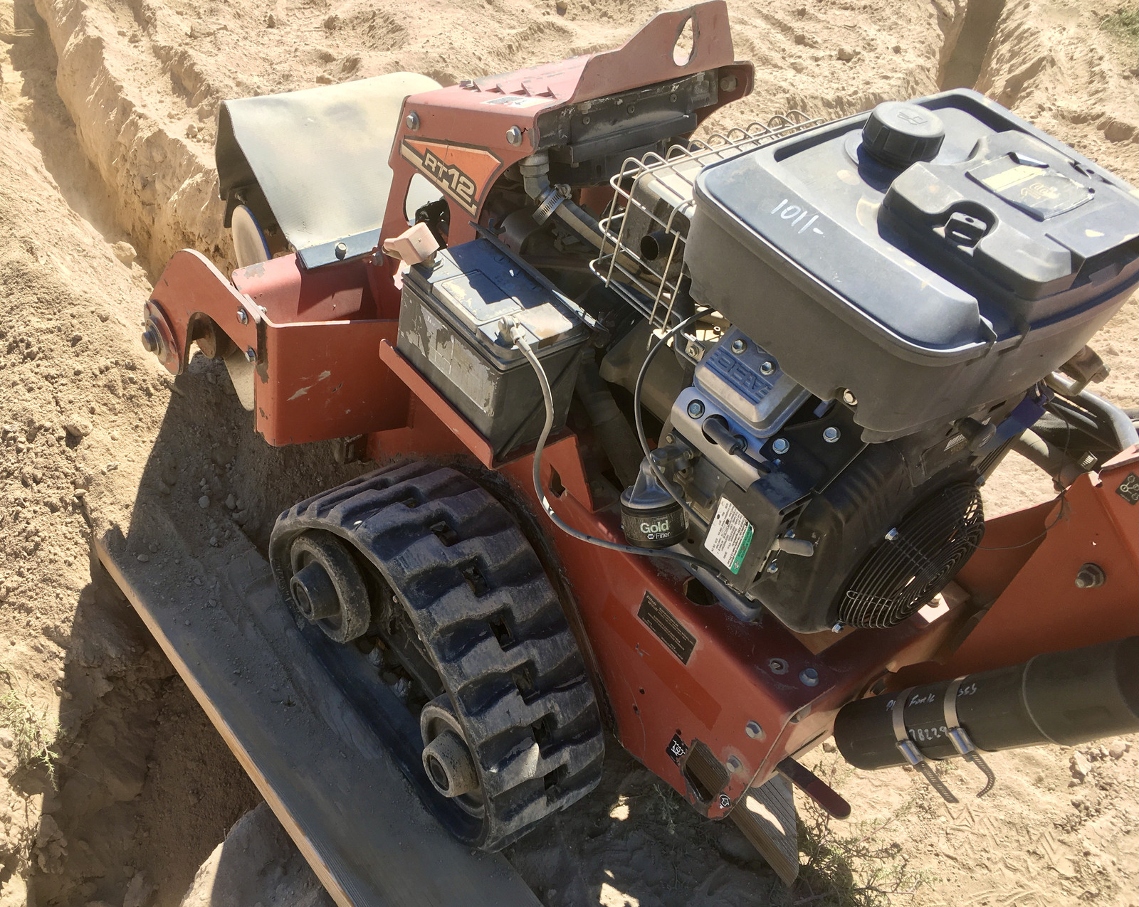 If you’ve never run a big trencher like this before, they’re fairly simple. You roll them to where you want to start the trench, use one handle to start the big cutter chain spinning, swing it down into the ground, then start working backwards - they cut in reverse. Dirt comes out, dirt gets pushed to the side, and you ideally have a nice, clean trench in front of you!