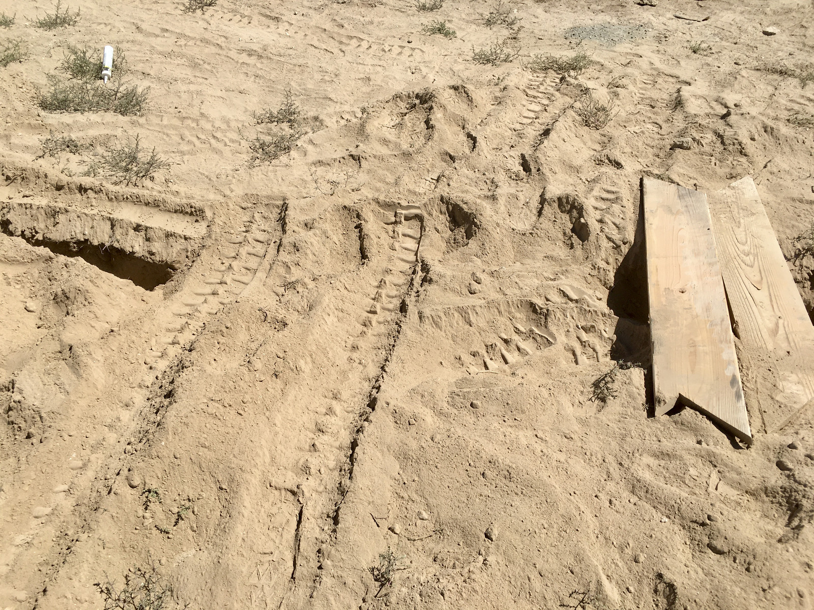 Crossing the trench took a bit of figuring out, where I had the “T” corner. A bit of inadvertent experimentation told me that the trencher would happily get stuck in the trench it dug, and I spent a while cramming stuff under it to get it out. Random pieces of lumber, however, work well enough to get the tracks across ditches you’ve already dug.