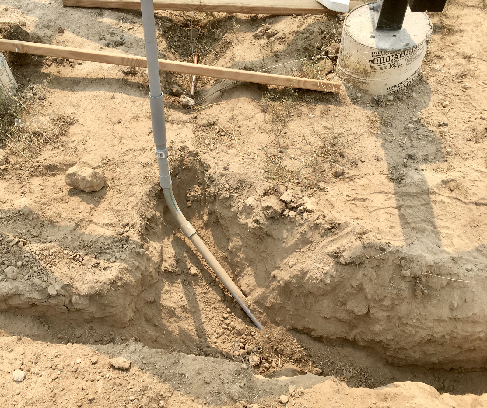 Just… start cutting. I eventually settled on working on about 20’ at a time. Swing the pickaxe while straddling the trench, cutting up the bottom and loosening any rocks. You’ll get a feel for what’s down there quickly. Once the rocks and dirt are loose, kneel down next to the trench with your trenching shovel and, working sideways, clean out the bottom. It sucks. It’s slow. It’s very, very good exercise! I did this during heavy smoke (because, of course, the project timeline works out like that), and was good for about 3 hours of this in the morning before it either got too hot, too smokey, or my body told me it was probably a good idea to quit for the day if I wanted to go back to it the next day.