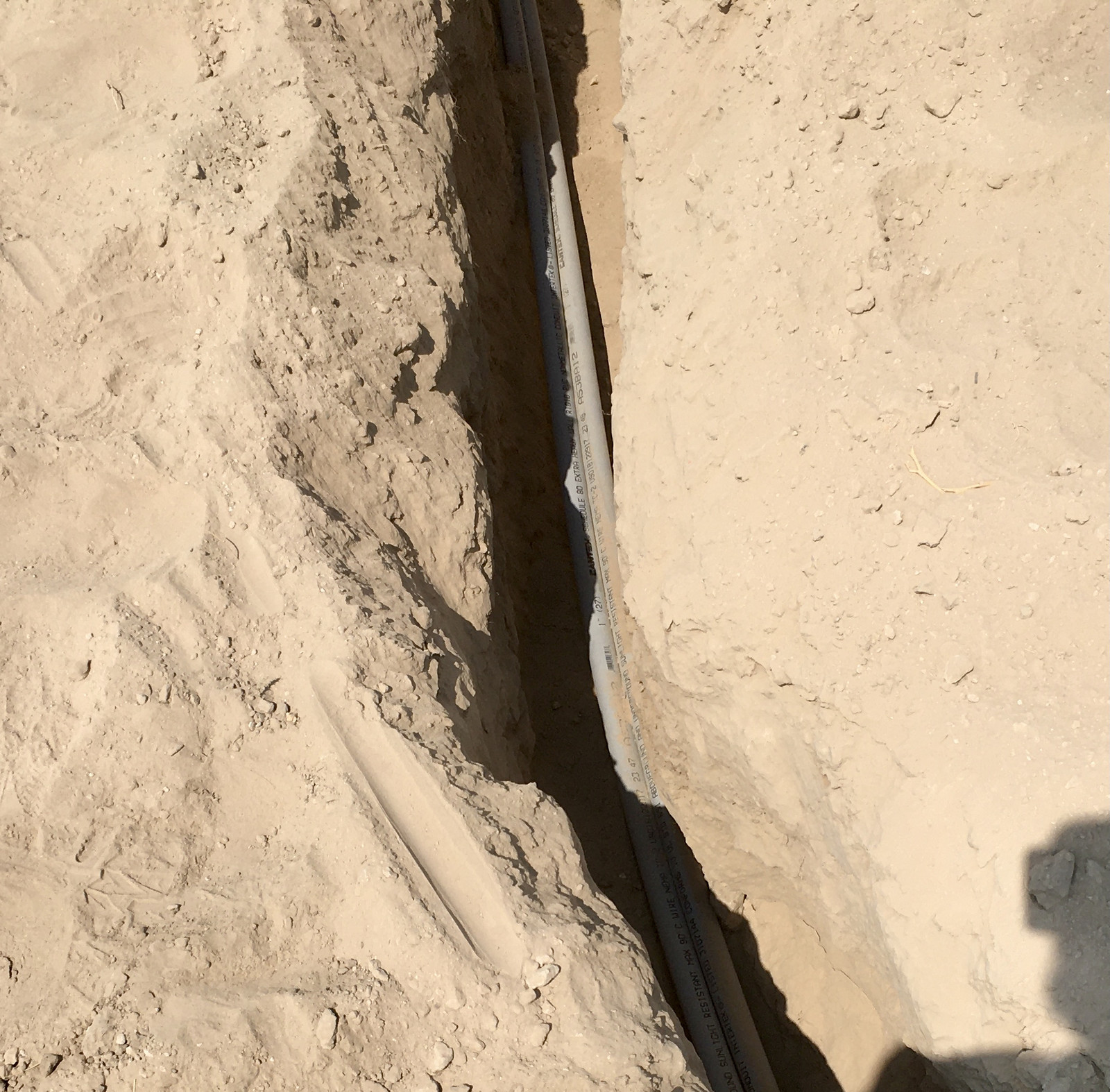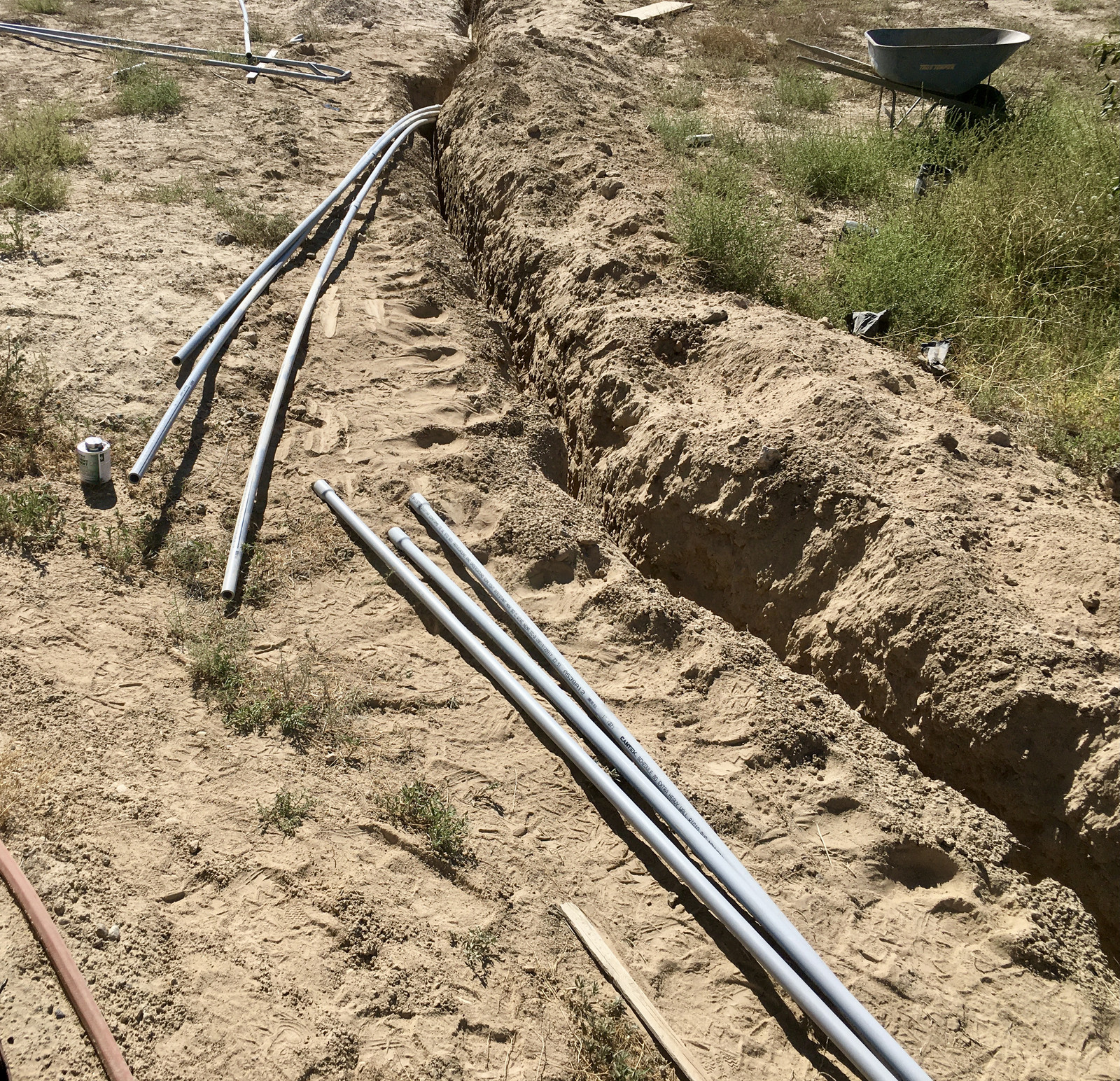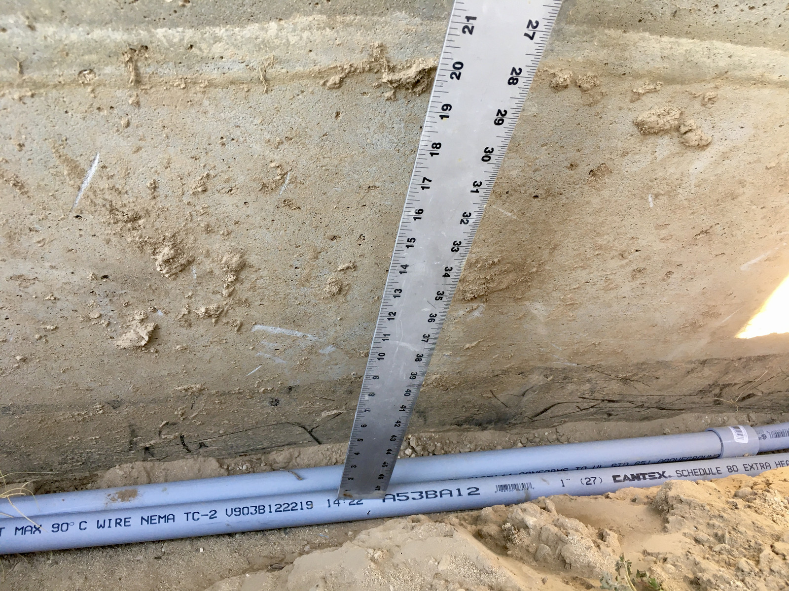 There are a few ways to trench cables through this area in a NEC-compliant manner. I could go with 6” of trench depth and metal conduit, I could go with 18” of trench depth and PVC, or I could go with 24” of depth and underground feeder. Talking to electricians out here, everyone had the same advice: “Go with PVC.” And, I’ll add that the actual wording in NEC isn’t 18” of depth - it’s 18” of cover. Big difference if you’re throwing a few pieces of 1” conduit down there.
