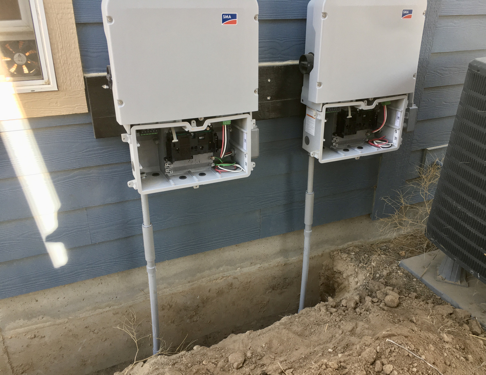 NEC is a little vague about mounting inverters on the side of a house. Are PV circuits running to them “on or in the house”? Is conduit separated from the house by a few inches considered “on” the house? All wonderfully vague. So I called the people responsible locally and got a concrete answer: By their interpretation (don’t expect this to match anyone else’s interpretation), inverters are allowed on the side of the house. However, PV circuits (DC from the arrays) must come straight up from the ground to the inverters, over a minimum feasible distance. So don’t put your inverters 8’ in the air and run conduit horizontally 20’ to them. Mark the circuits, and they’ll pass that out here. Great! However, this means I need to trench along the side of the house to all the inverters, instead of running the conduit along the foundation from the corner.