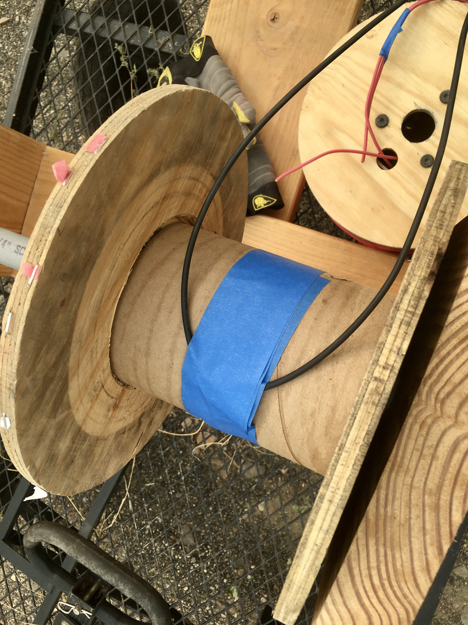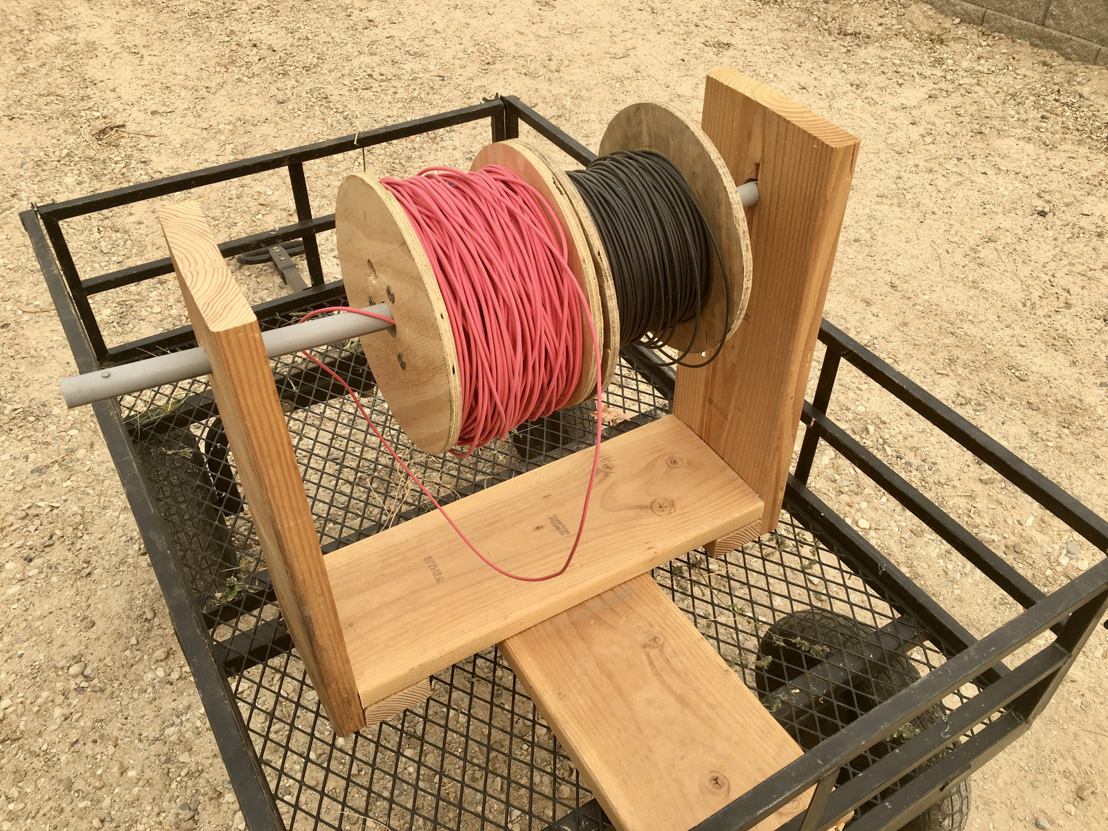 With all the twine done, the next step is wire. And here, I had a bit of a problem. For the two large A-frames, I needed to run two reds and two blacks, along with the ground wire - but all my red wire was on one spool, as was all the black. If you wonder why certain sites allow you to order multiple spools? This is why. I decided to unspool one and “double it over” in the middle so I could feed two strands off each spool at once. My first attempt was in the house and ended in utter disaster, tangles, snarls, and took an hour or two to sort out. So, I decided to do something with the space we have around.