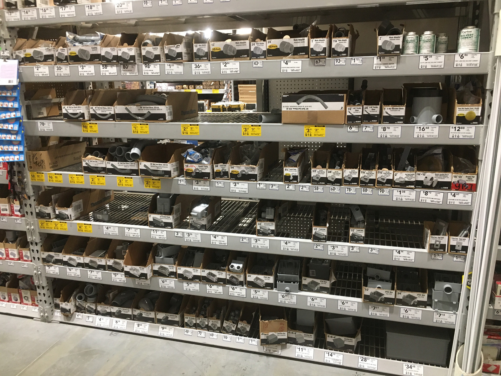 Trying to get my solar project finished, I started running into plenty of supply chain issues towards the end. You want PVC adapters through certain sizes? Nope. They’re literally out of stock almost everywhere. Electrical supply stores tended to be better than the home improvement stores, but… this was one of our local home improvement stores in December. This is the PVC conduit adapter section for electrical work. Note the absolutely empty spots, and the fact that very few of the boxes have much in them. It was a problem.