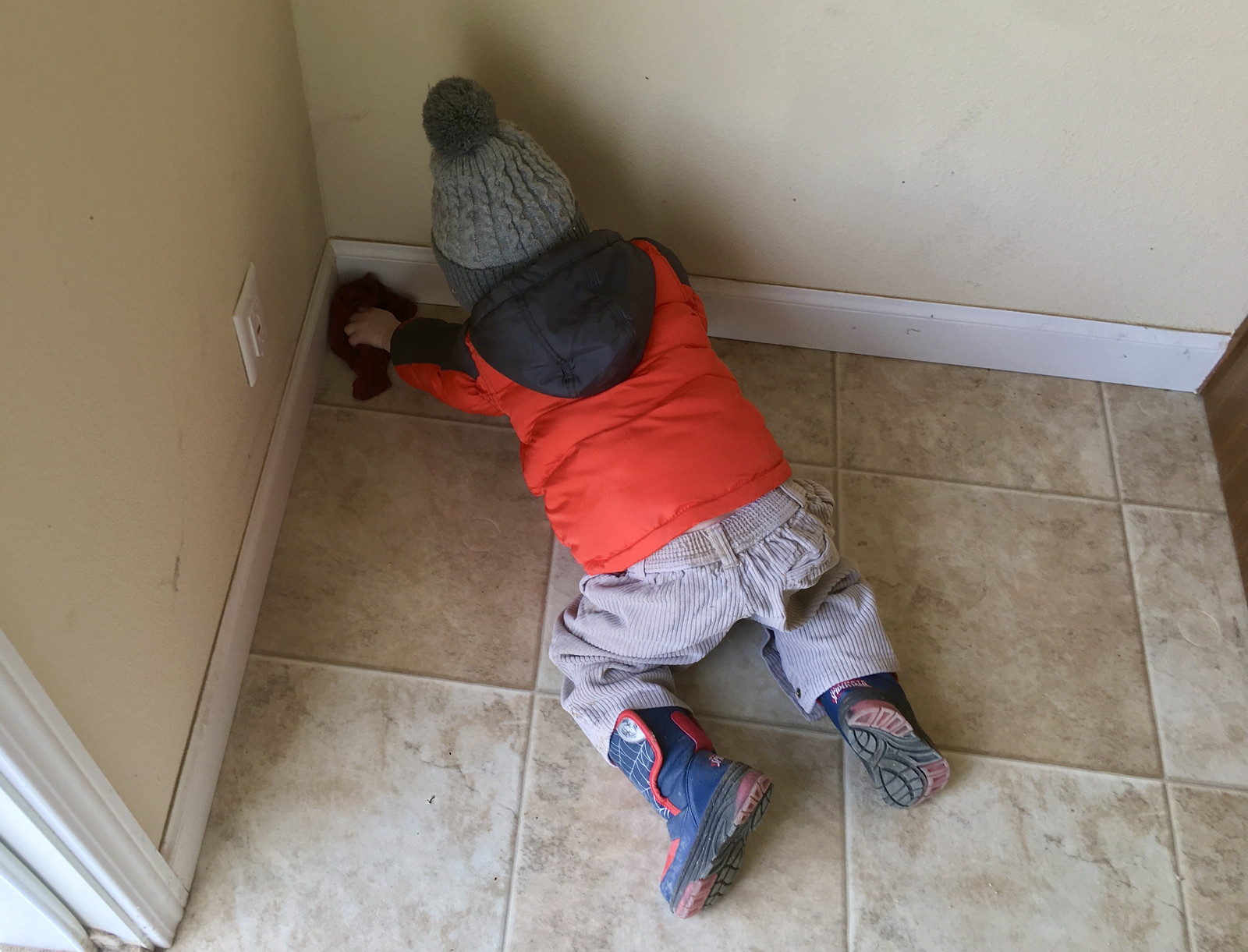 With the corner cleaned out, I took the opportunity to wipe it down - which, as implemented, involved my son deciding that he was going to help wiping it down, and he proceeded to do a pretty good job of it! I… forgot we had an outlet down there. The GFCI was tripped from some power glitch or another. Apparently nothing else important is on that circuit…