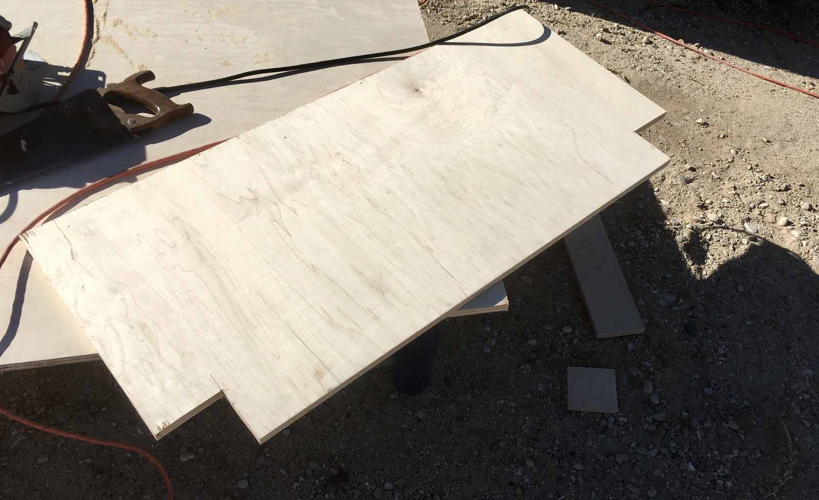 With one of the shelf supports done, I went back outside, cut down a sheet of plywood with a circular saw, and sanded the edges a bit. It may surprise some people to learn that I’m not urethaning this shelf, and I’ll simply say, “Yet.” Mostly because it’s still quite cold outside and urethane doesn’t work well in the cold. I might just put some contact paper down too.