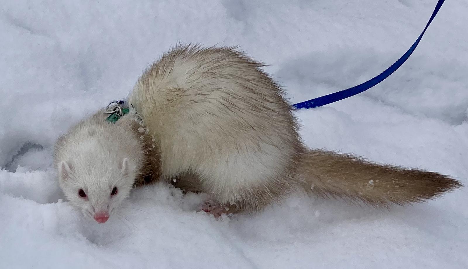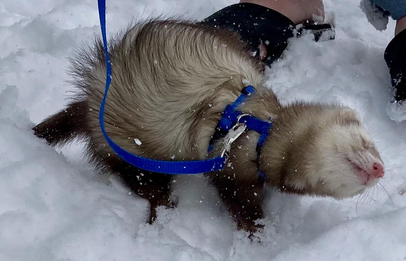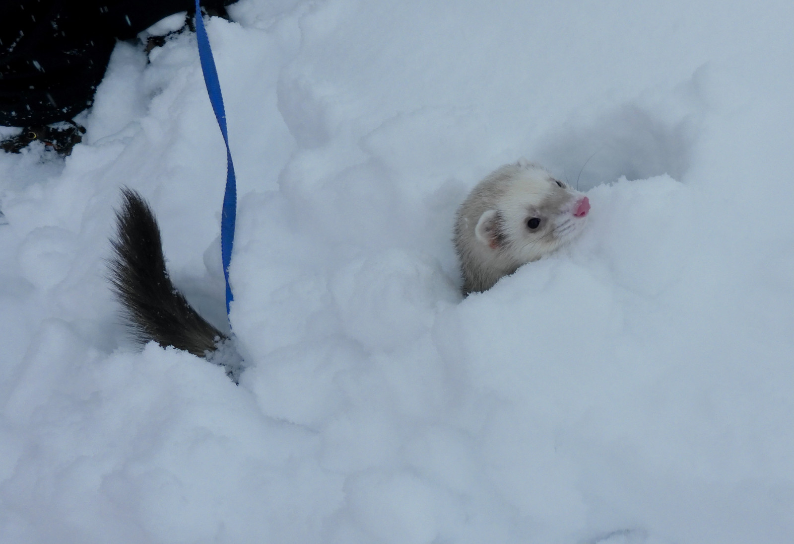 Another question I feel the need to answer is, “Do ferrets like snow?” And here, the answer is entirely “It depends on the ferret.” Some of ours can’t stand the stuff. Others? They love it. Toby (~8 month old ferret boy) absolutely can’t get enough of the snow. It’s fun to bounce in, and great fun to shake in! This is a full body, nose to tail, ferret twist!