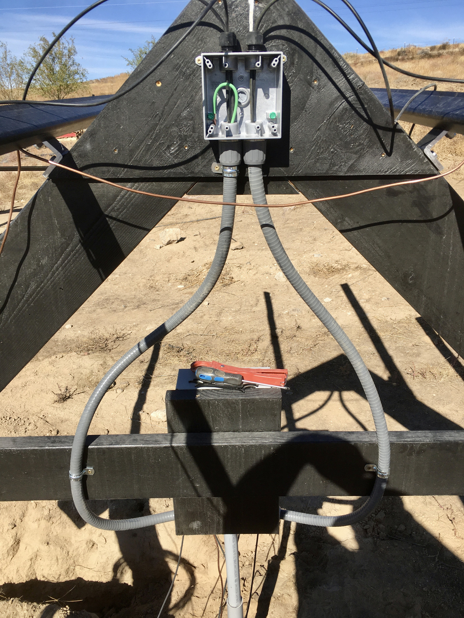 You can see the ground wiring above - the bare copper loop across the top. This uses the Iron Ridge grounding clips, which clamp down firmly on the grounding wire, connecting it firmly it to the rail in an electrically conductive manner (theoretically). I’ve run “full loops” on each end of the big As. They go from the ground rod (one at each end), to all four rails, and back down to create the loop. Plus, a run from the ground rod to the junction box. Is it overkill? Yes. Should it keep things moderately well grounded? Also, yes. Should you tighten these with an impact driver? Probably not. They tend to bend out the lower “wire cup” if you do this, but I’m pretty comfortable in the contact created when I do that!