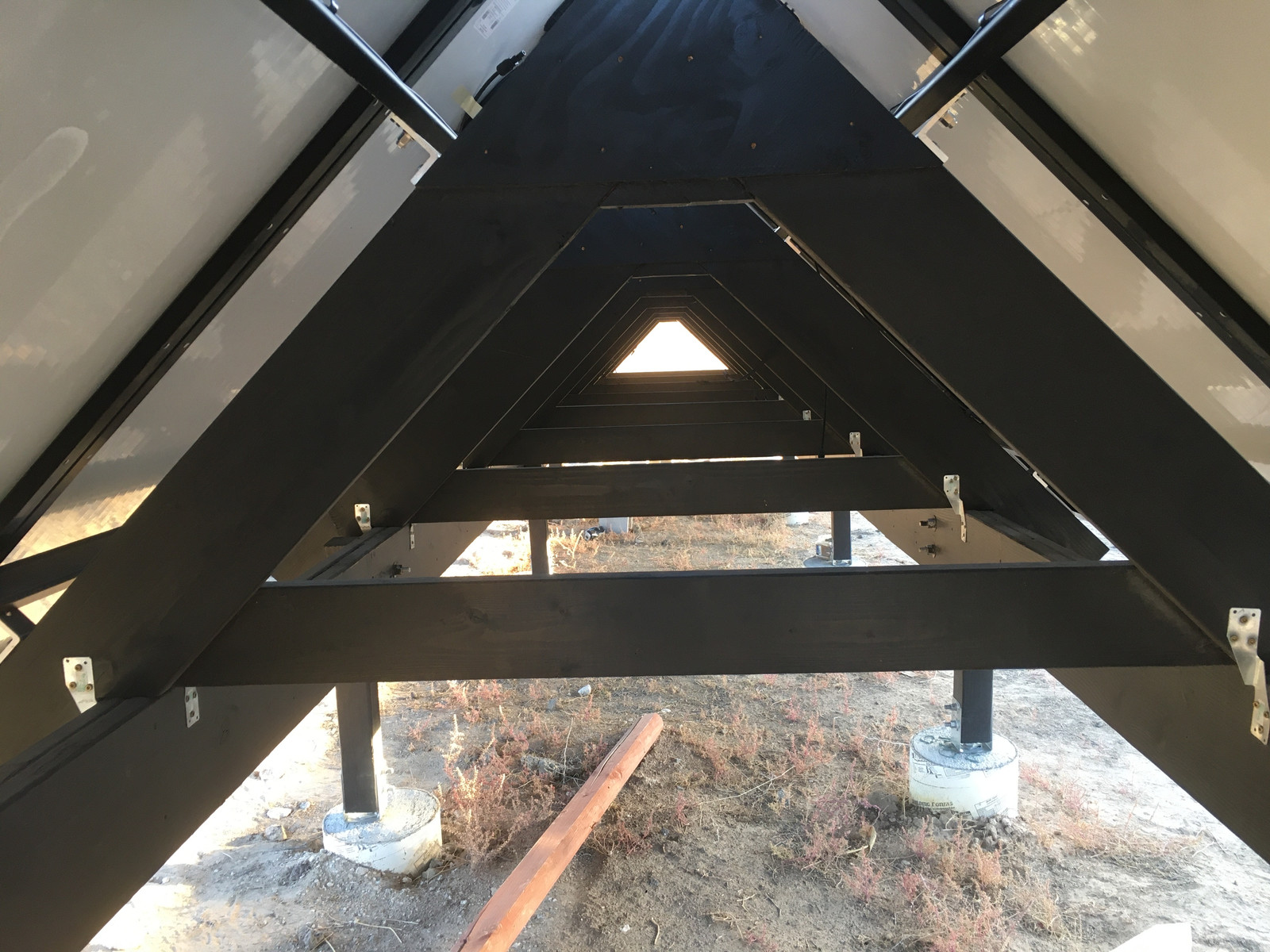 I spent a lot of time working under the As here, though. It’s an interesting place to work. Not terribly enjoyable on cold, windy days, because it funnels the wind nicely. However, this means that with the panels actually producing, they’ll have a nice cooling breeze through them. Throw in the gap at the top, some convection, and I expect these panels to run far cooler than they would on a roof. Since installation, this has generally proven correct - they run quite cool to the touch! I’m sure on some hot, stagnant summer day they’ll get hot, but this panel arrangement is really well suited to staying cool (near ambient). On any day with a light wind, they’re at ambient, and on days without wind, they still create their own convective flow (you can see the heat distortion coming out the top). This helps production significantly - the difference between an 0C panel and a 40C panel is nearly 16% under identical lighting.