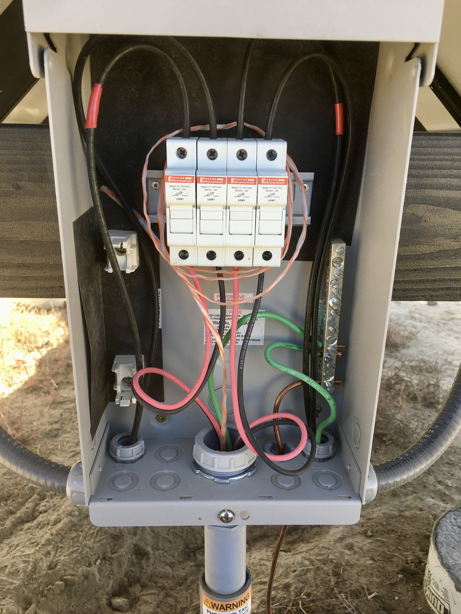 Are these disconnects needed? NEC 690.15(A) seems to imply they are, the inspector said he expected them to be there, and I think they’re very useful. These provide me a way to break the power at the panel side, before it runs through the ground to the inverters. The fuses are not break-under-load capable, and the boxes are labeled as such. But, should I need to work on the inverters, I can shut off the disconnect at the inverters (stopping the current - that end is load break rated), open these fuses (disconnecting the array), and then do what I need over at the house. Should I need to work on the array or combiner box, I can do the same process, then open one of the MC4 connectors to disconnect everything.