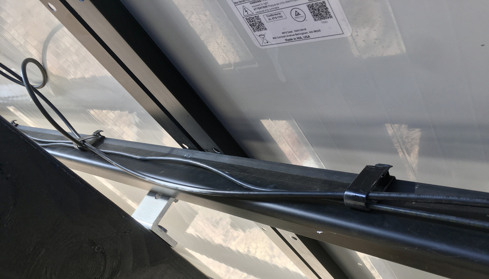 With the panels installed, the task is almost done, right? Not so fast. There’s still quite a bit left to do, and it involves working under the panels extensively. The panels come with the connectors wired up and coiled (you can see them on the back of the left panel here). These are, on mine, MC4 connectors. I’ve run MC4 extensions along the rails so that I can finish wiring things up, and you can see the black wires hanging out of the combiner box (really, just a panel side disconnect) on the frame.