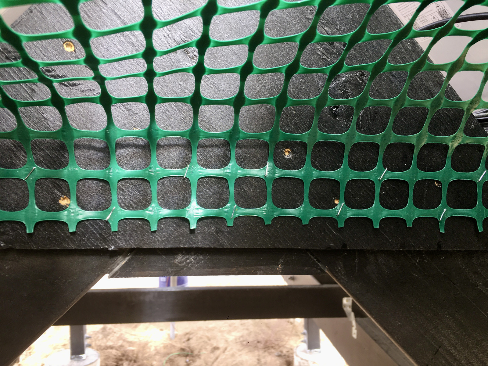 The ends? Staples. There was a lot of “kerchunking” for this part of the project, and a staple gun is every bit as satisfying as one might hope. The mesh isn’t strung tight - like everything else, there’s some room for expansion and contraction. What’s the thermal expansion coefficient of plastic garden fence? I have no idea at all. So I just left some slack.