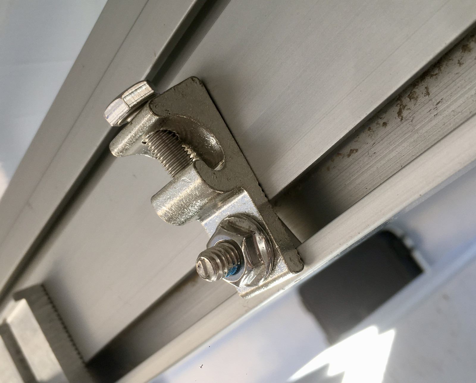I’m using the Iron Ridge UFOs (Universal Fastening Objects) to connect the panels to the frames. These clamp the panels in place, and also serve as grounding paths - the sharp teeth cut through the aluminum anodizing on the frames to make a metal-metal path.