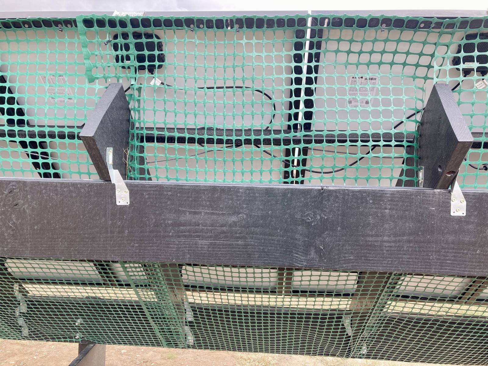 After playing around a bit, I figured out a way to route the plastic mesh that would give a nice gap between the mesh and the wiring, and stapled/zip-tied it in place. Like this!