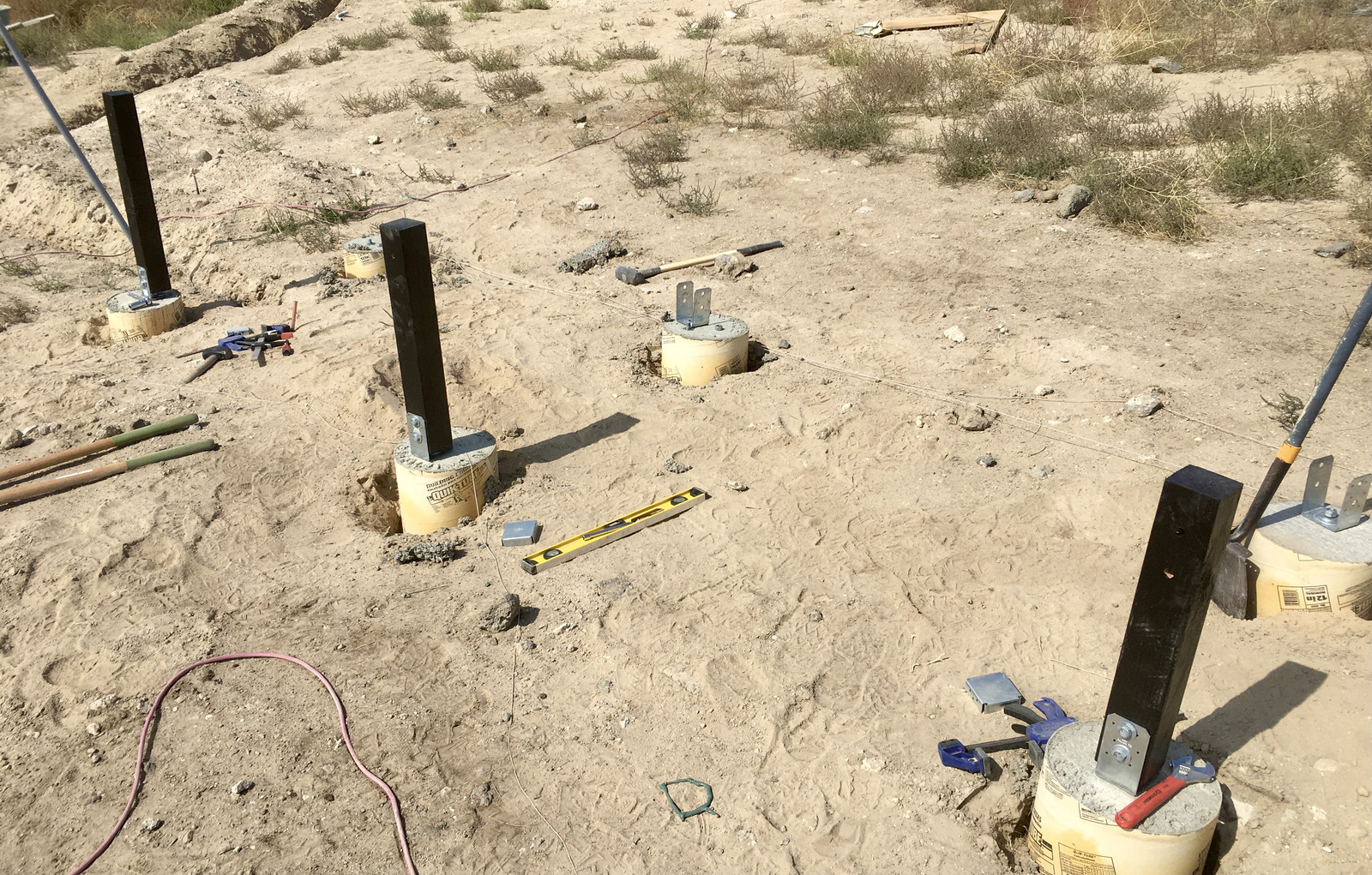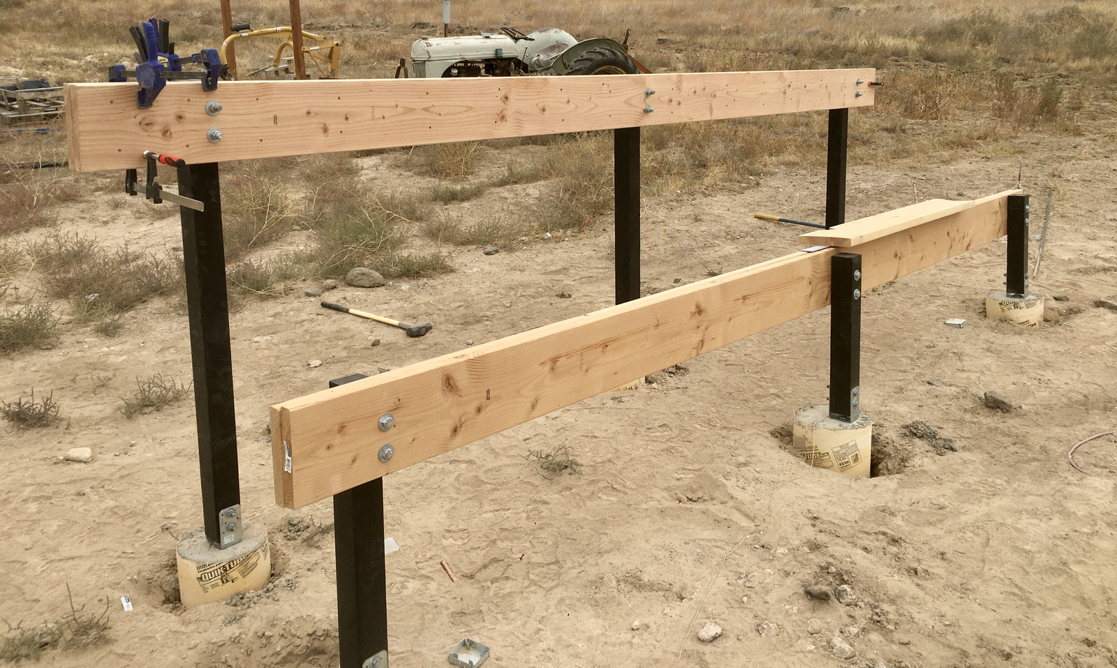 One of the major changes I made, as compared to the big A-frames, is that I decided not to worry about leveling the footings relative to each other. The front row is lower than the back row, and they’re not level (side to side) either. Instead of having the footings sticking way up to level things, I just decided to use the length of the uprights to handle leveling the frames. This means somewhat less concrete, and somewhat more 4x4 - which I’d say is cheaper than more concrete, but only if you are doing this before lumber prices went crazy…